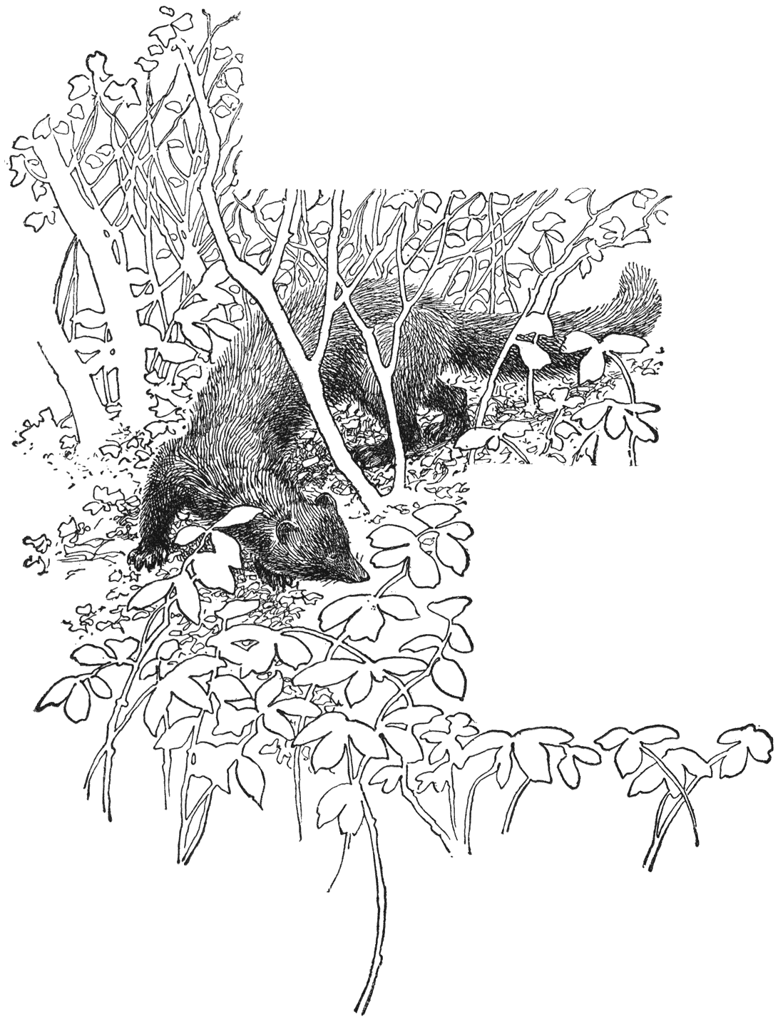 … waar de berin en haar jongen bezig zijn op hun gulzige, grappige manier boschbessen te plukken …