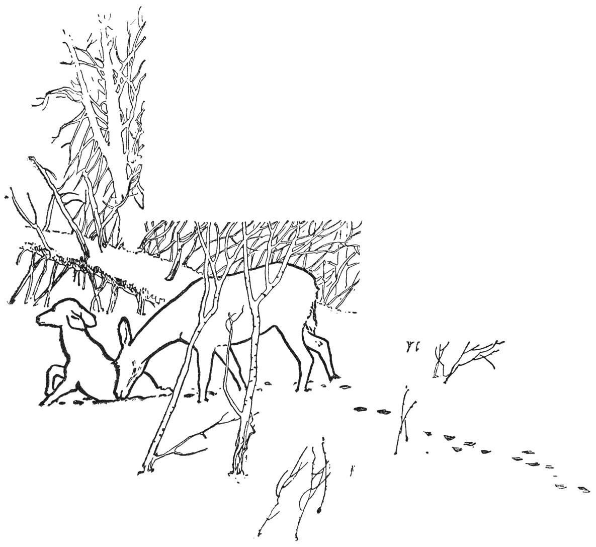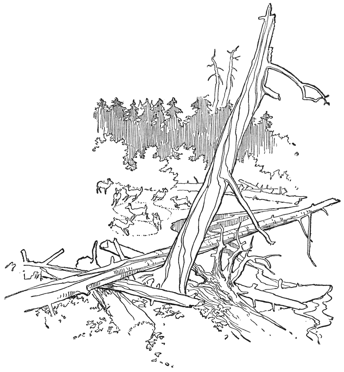 Er waren van allerlei plekjes waar de oever breeder en effener was, en tien tenminste wel leverden meer eetbaars [11]op; maar de herten kwamen hier in grooter getale dan ergens elders. Dicht in de buurt was een groote, natuurlijke wei, met dichte schuilplaatsen op de hellingen er achter, waar ’t leefde van herten. Eer ’t avondeten in de wilde wei begon, kwamen ze dit open oeverplekje op, om een uurtje te spelen; en ik twijfel er niet aan of die plaats was een echt speelterrein, zooals konijnen en vossen en kraaien, en eigenlijk de meeste dieren in ’t wild, zich uitkiezen om pret te maken.