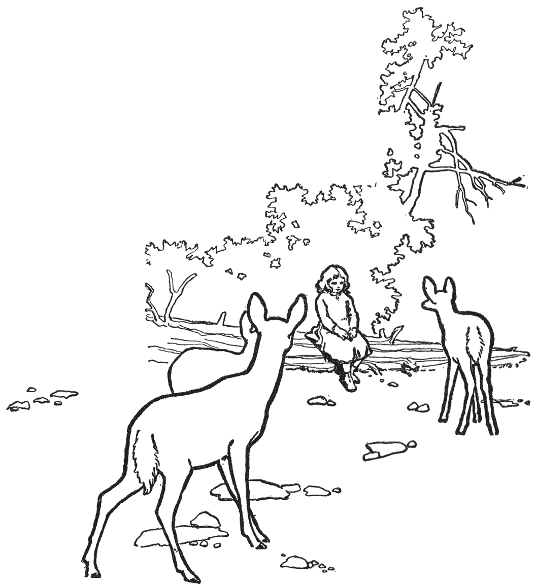 Dit alles is aan jagers wel bekend; maar nu komt de uitzondering. Nadat ik de herten een paar weken [19]had gadegeslagen op een van hun speelterreinen, kwam er een gids in het kamp met zijn vrouw en dochtertje. Ze waren op weg naar hun eigen kamp voor het jachtseizoen. Voor ’t plezier van het kleine ding, dat van alle dieren hield, nam ik haar mee om haar de spelende herten te toonen. Terwijl ze op den oever ronddraafden, stuurde ik haar onzen schuilhoek uit, in een plotselinge aanvechting van nieuwsgierigheid, om te zien wat de herten en hertekalfjes zouden doen. Zooals haar gezegd was liep ’t kindje heel langzaam tot ze zich in hun midden bevond. Ze waren eerst onthutst; twee van de oude herten kringden dadelijk onder den wind om lucht van haar te krijgen; maar zelfs nadat ze haar geroken hadden, dien verdachten menschengeur, waar de meeste van hen bang voor hadden leeren zijn, naderden ze onbevreesd met naar voren gestoken ooren, en hun uitdrukkingsvolle staartjes naar beneden, zonder iets van dat zenuwachtige gekwispel, zoo opmerkelijk zoodra hun eigenaars den eersten verdachten geur uit de lucht opvangen. Het kind zat ondertusschen op den oever met oogen wijd open van nieuwsgierigheid naar de aardige dieren te kijken, maar ze was dapper gehoorzaam aan mijn eerste, gefluisterde aanwijzingen en hield zich zoo stil als een gejaagd konijntje. Twee gevlekte kalfjes kringden al speelsch om haar heen, maar het derde ging regelrecht naar haar toe, met vooruitgestoken neus en ooren om zijn vriendelijke gezindheid te toonen, en trok zich toen terug [20]om grappig met zijn voorpootje te stampen, dat het zwijgende kind zich zou verroeren of spreken, en misschien ook om haar op hertenmanier te laten zien dat hij, al deed hij nu zoo toeschietelijk, toch in ’t geheel niet bang was.
