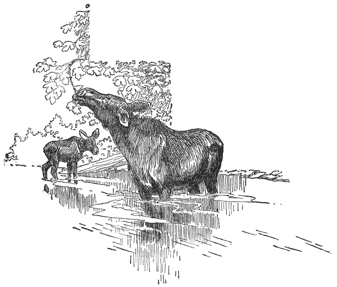 Ofschoon de herten het talrijkst en het merkwaardigst van de dieren zijn op wie men zonder geweer kan jagen, zijn ze zeker niet het eenige wild, dat het hart van den jager met blijdschap vervult en maakt dat ’t hem plezier doet als zijn weitasch leeg is. Elanden kan men aan hetzelfde water vinden, en wanneer men ze zeer bedaard en langzaam nadert in den zomertijd, vooral met een kano, toonen ze weinig angst voor den mensch. Toen ik den vorigen zomer ’t water doorgleed, ’t Matagammon-meer in, doemden er in de nauwe geul een wijfjeseland en haar kalf voor me op. Ik bespiedde haar een poosje stilletjes, en merkte haar eigenaardige manier van eten op;—nu eens trok ze wat sappig watergras omhoog, dan weer rekte ze haar hals en haar grooten snuit uit om een bekvol bladen van den watereschdoorn af te rukken, eerst het een en dan het ander, als een jongen met twee appels. [22]Ondertusschen snuffelde het kalf langs den oever en schonk geen aandacht aan de kano, die hij best zag, maar die zijn moeder niet merkte. Na ze een paar minuten te hebben gadegeslagen, gleed ik omzichtig naar den overkant en liet me stroomafdrijven, om te zien of het mogelijk zou zijn er voorbij te komen zonder ze te verstoren. Het kalf was met iets op den oever bezig, de moeder stond diep in het watergras, toen ik voorbijdreef, laag in mijn kano gezeten. Ze zag me toen ik op haar hoogte was, en nadat ze me even vol verbazing had aangekeken, ging ze weer aan ’t eten. Toen wendde ik de kano langzaam en ging onder den wind liggen, geen tien meters van hen af, om elke beweging van beteekenis te bespieden. Het kalf was nu dichter bij me, en de moeder liet hem door een zwijgend bevel terugkomen, aan dien kant van haar waarmee ze van me afgekeerd stond; maar de nieuwsgierigheid van het kleine beest was opgewekt door het verbod, en hij bleef maar onder den buik van zijn moeder doorgluren, of zijn hals verdraaien om achter over haar hielen heen te zien wie ik was en wat ik uitvoerde. Maar geen zweem van angst; en ik trok eindelijk langzaam achterwaarts en liet hem aan zijn maaltijd op dezelfde plaats waar ik hem had aangetroffen.