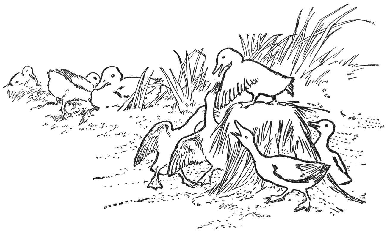 Dat was hun eerste les, en hun belooning was nabij. Het mannetje was sinds ’t aanbreken van den dag [37]aan ’t visschen geweest; nu begon hij voorntjes uit een draaikolk aan te brengen, waar hij ze opgeborgen had, en zijn hongerige gezin te voeren, ze daarbij op zijn manier verzekerend dat deze groote wereld, die zoo verschilde van ’t hol in den oever, een goed oord was om te leven, en dat er geen eind kwam aan al ’t lekkers dat ze opleverde.