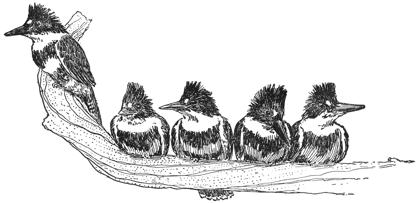 Er waren er drie, toen ik ze voor ’t eerst ontdekte, op vooruitstekende takstompen gezeten boven de dansende golfjes van een ondiepe plek, waar ’t krioelde van zwartvisch en voorntjes en jonge zalm en levendige, jonge roodvinnen. Plotseling vielen ze, alsof er af! bevolen was, met den snavel vooruit in de rivier. In een oogwenk waren ze er weer uit en schoten ze ieder naar zijn eigen tak terug, waar ze hun kop achteroverwierpen en hun voorntjes met schokjes door hun keel wurmden, zoo haastig dat [40]ze er bijna van stikten. Toen dat gebeurd was, begonnen ze op hun takken heen en weer te dansen, onder een uitbundig geratel en gegichel.