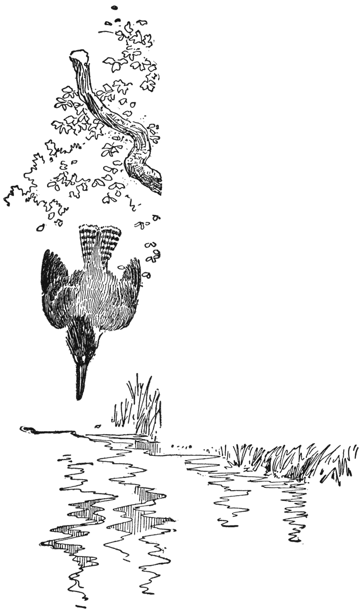 Een paar morgens later, toen ik langs den oever sloop, trof ik een waterkom, die geheel van den hoofdstroom was afgesloten, waar wel twaalf of meer verschrikte voorntjes in rondspartelden, alsof ze er zich niet thuis voelden. Terwijl ik naar ze stond [38]te kijken en me er over verbaasde dat ze de droge bank waren overgekomen, die de kom van de rivier scheidde, kwam er een ijsvogel stroomop schieten met een visch in zijn snavel. Toen hij mij in ’t oog kreeg, zwenkte hij stilletjes en verdween om de landtong stroomaf.