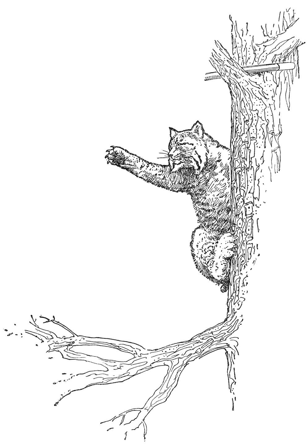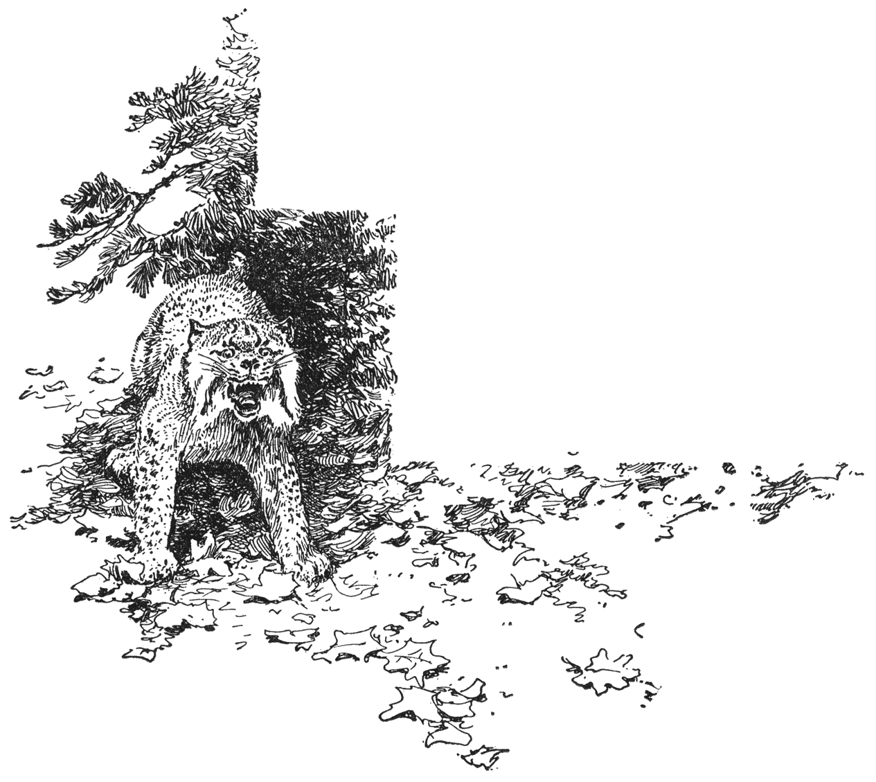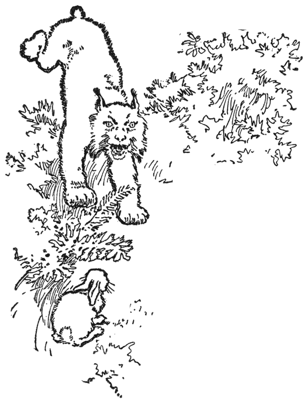 Dat Pekompfs listigheid van de soort der katten is: achterdocht, zonder het sluw overleg of de kracht van den vos of den wolf, blijkt eigenaardig uit een gewoonte die lynx en wilde kat gemeen hebben, namelijk: dat ze al wat ze rooven meesleepen naar den top van een hoogen naaldboom om ’t te verslinden. Als ze een haas of een visch eerlijk zelf gevangen hebben, eten ze dien gewoonlijk op de plaats zelf op; maar als ze zoo’n dier uit een strik of een bergplaats stelen, of van een kleinen jager, keert de kattenachterdocht terug—mèt een vaag besef van kwaad te doen, dat alle dieren in minder of meerdere mate hebben—en ze maken zich met den buit uit de voeten en eten hem gulzig op, daar waar ze meenen dat niemand hen ooit zal ontdekken. [52]