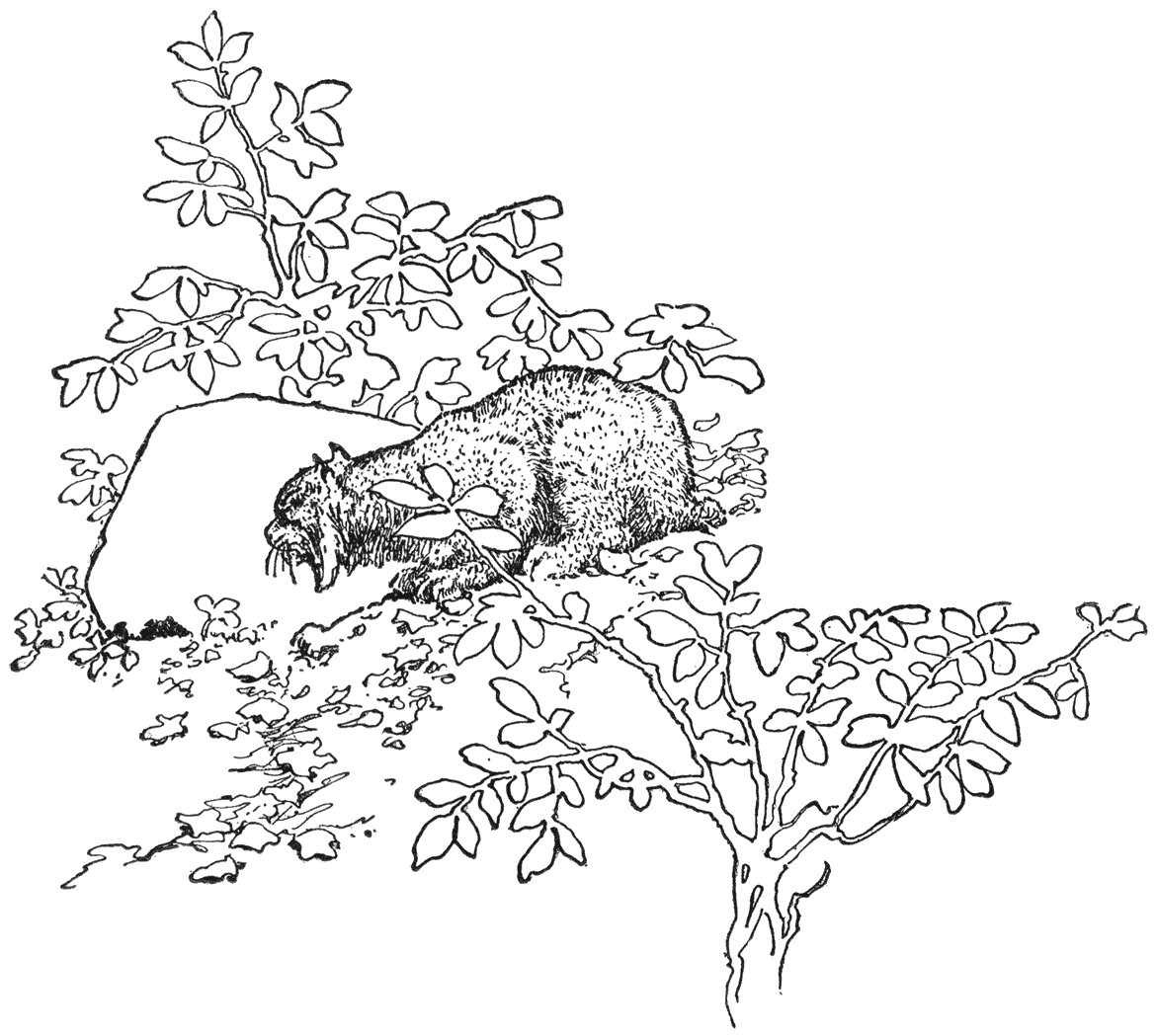 Wanneer het uw eerste wilde kat is, zult ge ternauwernood weten wat te doen—doodstil blijven staan is altijd het beste, tenzij ge een stok of een geweer in de hand hebt—en wanneer ge Pekompf al veel vaker ontmoet hebt, verkeert ge nog precies zoo in ’t onzekere over wat zij dezen keer doen zal. De meeste dieren in de natuur, al zijn ’t ook echte wilde dieren, gaan ’t liefst stilletjes hun gang en zullen diezelfde neiging in u eerbiedigen. Maar wanneer ge plotseling voor een wilde kat staat, zijt ge nooit zeker van haar volgende beweging. Dat is omdat zij een gluiperig, verraderlijk beest is, net als alle katten, en nooit precies weet welke houding zij ’t best tegen u aan kan nemen. Zij wantrouwt u onredelijk, omdat zij weet dat gij háár met reden wantrouwt. Gewoonlijk gluipt zij weg, of springt plotseling de dekking in, al naar uw manier van naderen. Maar ofschoon kleiner dan èn de Canadeesche lynx èn de panter, is ze van nature woester en soms duikt ze neer en grauwt u toe, of zelfs springt ze u naar de borst bij de eerste beweging.