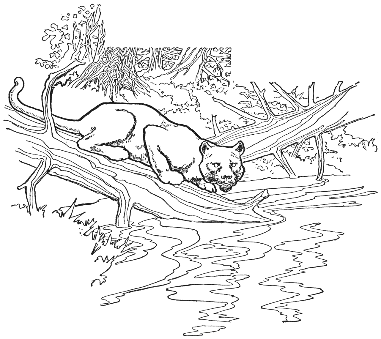 Het is altijd goed in het bosch aan zoo’n waarschuwing gehoor te geven. Ik keek haastig stroomop en stroomaf, maar slechts de snelle stroom van de rivier leefde. Ik zocht zorgvuldig de oevers af en tuurde achterdochtig in het bosch achter me; maar behalve een winterkoninkje dat er uit kwam glippen—’t is net of ’t altijd iets zoekt, dat het verloren heeft, en naar zijn meening hebben wij daar niets mee te maken—lagen de oevers ongerept en stil, alsof ze zoo juist geschapen waren. Ik zwaaide mijn vliegen weer uit. Wat was dat, net achter ’t golfje, waar die zilveren gevallen was? Er bewoog, kronkelde, sloeg en draaide zich [47]iets zenuwachtig. Het was een staart, het staartpuntje, dat niet stil kan zijn. En daar—onwillekeurig liep ’t me koud over den rug, toen ik de omtrekken ontwaarde van een groot, grijs beest, op een omgevallen boomstronk uitgestrekt, en merkte dat zijn glinsterende, wilde oogen pal op mij gericht waren. Zelfs terwijl ik naar ’t beest keek, vervaagde het als een schaduw der bosschen. Maar waarop loerde de panter daar, voordat hij mij beloerde?