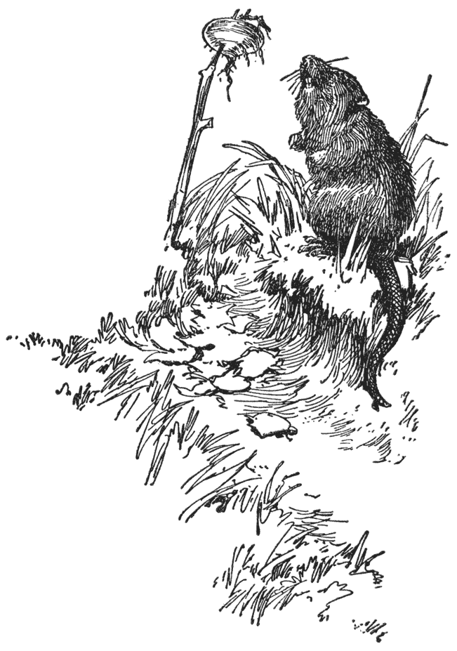 Musquash weet best dat jonge duikers of zaagbekken of zwarte eenden, wanneer ze zooals nu in open water gesnapt worden, altijd terug trachten te komen naar de plek, waar moeder haar verstopt heeft eer ze wegging. Dat trachtten de kleine stakkerds nu ook te doen, maar slechts om teruggedreven, in wilde beweging gehouden te worden door de muskusrat, die zich af en toe uit het water ophief en met haar leelijke kaken over elkaar schoof, in afwachting van de smulpartij. Zij was de eieren misgeloopen, toen zij rondsnuffelde; maar jonge duikers zouden nog beter, nog meer opleveren.—„Jou heb ik!” hapte zij kwaadaardig, terwijl zij een uitval deed naar het naaste duikertje, dat bliksemsnel onder water schoot en ternauwernood ontkwam.