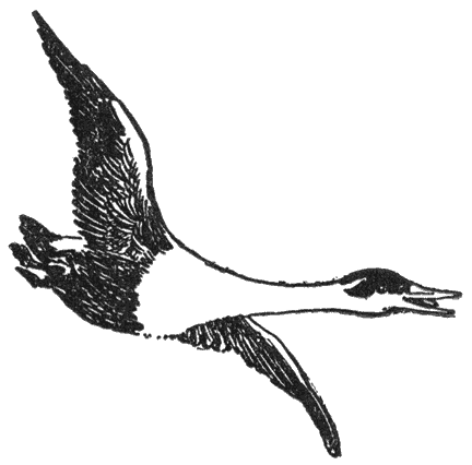 Als ze er maar eerst uit is, heeft ze niets plomps meer over zich. Haar korte wieken rijzen en dalen met een snelheid, die onze oogen tart te volgen. Zoo snel schiet een zwarte eend voor den wind naar lokvogels. Ge kunt haar vluggen, krachtigen slag hoog boven uw hoofd hooren, als ze niet roept. Haar vlucht is heel snel, heel gelijkmatig en dikwijls geweldig hoog. Maar als zij dalen wil, wordt zij altijd bang; dan denkt zij aan haar korte vleugels en hoe hoog ze is en hoe snel ze vliegt. ’s Winters op den oceaan, waar ze ruimte in overvloed heeft, komt zij [110]soms in een lange, mijlenlange schuine lijn naar beneden en plonst als een dolfijn door en over een reeks van golven, eer zij stil kan houden. Maar waar ’t meer klein is en zij op die manier niet kan dalen, beleeft zij duizelige oogenblikken.
