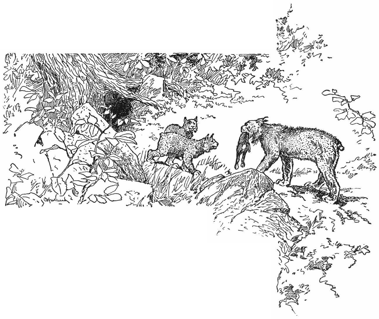 Eens, toen ik dagenlang onder het nest van een vischarend op den uitkijk lag naar de dieren die schuw aankwamen om het afval op te eten, dat de jonge vischarenden weggooiden als hun honger gestild was, bleek deze kattengewoonte al heel duidelijk. Andere dieren kwamen nader en aten rustig op wat ze vonden en glipten weer heen; maar de katten grepen een stuk met fonkelende oogen, alsof ze alle wet en gezag tartten, en grauwden vreeselijk onder ’t eten; of anders dropen ze gluips af, om het stuk in de hoogste takvork te verslinden, die maar houvast voor hun pooten wou geven. En eens zag ik in in November aan de kust van Maine een fellen strijd in de boomtoppen, waar een wilde kat ineengedoken zat te grauwen als een troep duivels, terwijl een groote adelaar boven haar zwierde en op haar stootte bij zijn pogingen om den buit mee te nemen, dien Pekompf gestolen had.