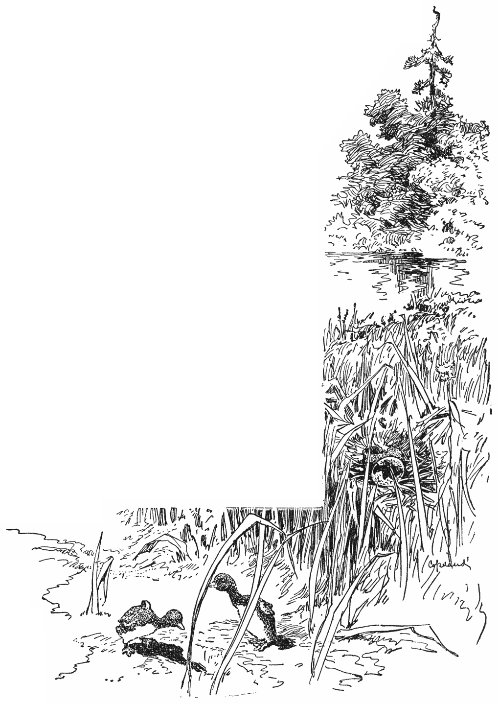Van alle duikers, die me aanriepen in den nacht of de meren ’s zomers met me deelden, gaf er me slechts één gelegenheid om haar van dichtbij gade te slaan. Het was op een ongerept meer, zoo afgelegen, dat niemand het nog eerder ’s zomers bezocht had, en een duikermoeder voelde zich zoo veilig dat ze den open oever had verlaten, waar ze gewoonlijk nestelt, en haar eieren op een veenklomp had gelegd aan den kop van een nauwe baai. Daar ontdekte ik ze een paar dagen na mijn aankomst.