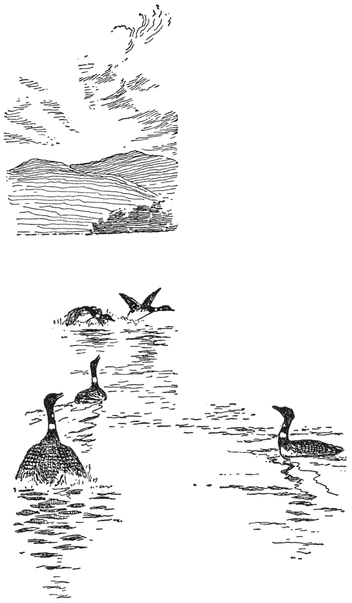 Eens in September, op een meertje, zat ik wel urenlang te loeren om dat te zien gebeuren. Twaalf of vijftien duikers waren daar verzameld en hadden er groote pret. Ze riepen elke duiker die op den trek daar overvloog naar beneden; hun aantal wies dagelijks aan. De schemering was de geliefkoosde tijd van aankomst. In de stilte hoorde ik Hukweem op grooten afstand, zoo hoog dat zij niets dan een stem was. Weldra zag ik haar in een grooten kring boven het meer zwieren.—„Kom neer, o kom neer,” roepen alle duikers. „Ik ben bang, oeoe-ho-ho-ho-ho-hoeoeoeieie, ik ben bang”, zegt Hukweem, die misschien een jonge duiker is, heelemaal uit Labrador op haar eersten trek, en zij is nog nooit eerder uit de hoogte neergedaald. „Vooruit, o kom oh-ho-ho-ho-ho-hon. Het zal je geen kwaad doen; wij hebben ’t ook gedaan, vooruit!” roepen alle duikers.