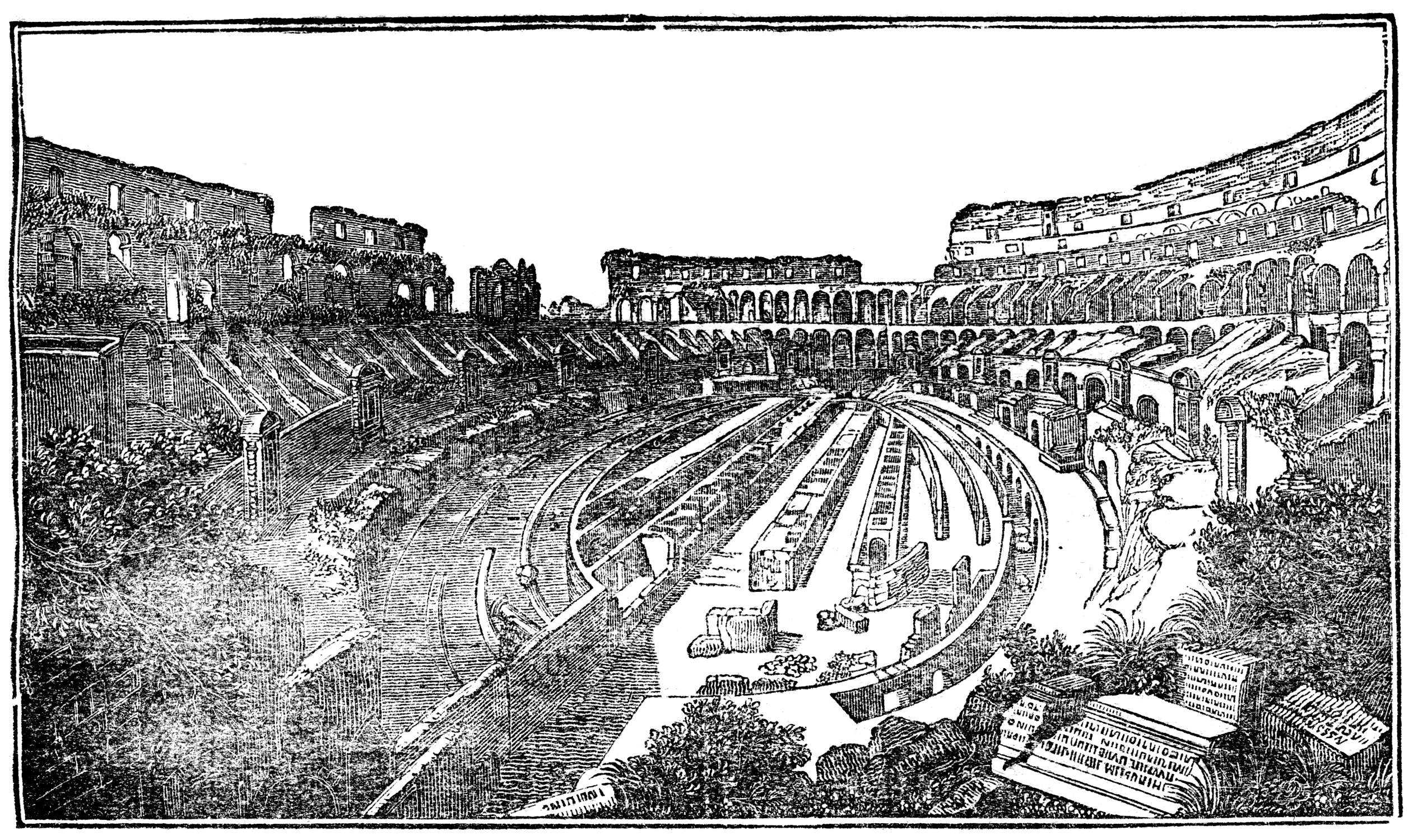 When the imperial power was firmly established at Rome, the sports of the amphitheatre were conducted upon a scale to which the Consuls of the republic had scarcely dared to aspire. Caligula, on his birth-day, gave four hundred bears, and as many other wild beasts to be slain; and on the birth-day of Drusilla, he exhibited these brutal spectacles, continued to the succeeding day on a similar scale[1]. Claudius instituted combats between Thessalian horsemen and wild bulls; and he also caused camels to fight for the first time with horses. Invention was racked to devise new combinations of cruelty. Many of the emperors abandoned themselves to these sports with as passionate an ardour as the uncultivated multitude. Sensuality debases as much as ignorance, because it is ignorance under another name. Claudius rose at daylight to repair to the Circus, and frequently remained, that he might not lose a single pang of the victims, while the people went to their afternoon meal. Sometimes, during the reigns of Claudius and Nero, an elephant was opposed to a single fencer; and the spectators were delighted by the display of individual skill. Sometimes, hundreds and even thousands of the more ferocious beasts were slaughtered by guards on horseback; and the pleasure of the multitude was in proportion to the lavishness with which the blood of man and beast was made to flow. The passion for these sports required a more convenient theatre for its gratification than the old Circus. The Colosseum was commenced by Vespasian, and completed by Titus (A. D. 79). This enormous building occupied only three years in its erection. Cassiodorus affirms that this magnificent monument of folly cost as much as would have been required for the building of a capital city. We have the means of distinctly ascertaining its dimensions and its accommodations from the great mass of wall that still remains entire; and although the very clamps of iron and brass that held together the ponderous stones of that wonderful edifice were removed by Gothic plunderers; and succeeding generations have resorted to it as to a quarry for their temples and their palaces; yet the “enormous skeleton” still stands, to show what prodigious works may be raised by the skill and perseverance of man, and how vain are the mightiest displays of his power when compared with those intellectual efforts which have extended the empire of virtue and of science.