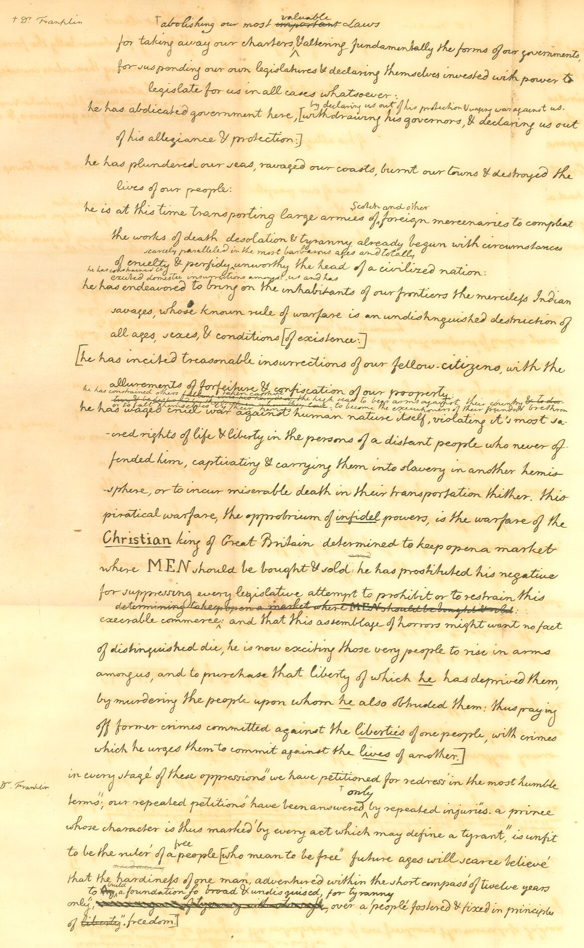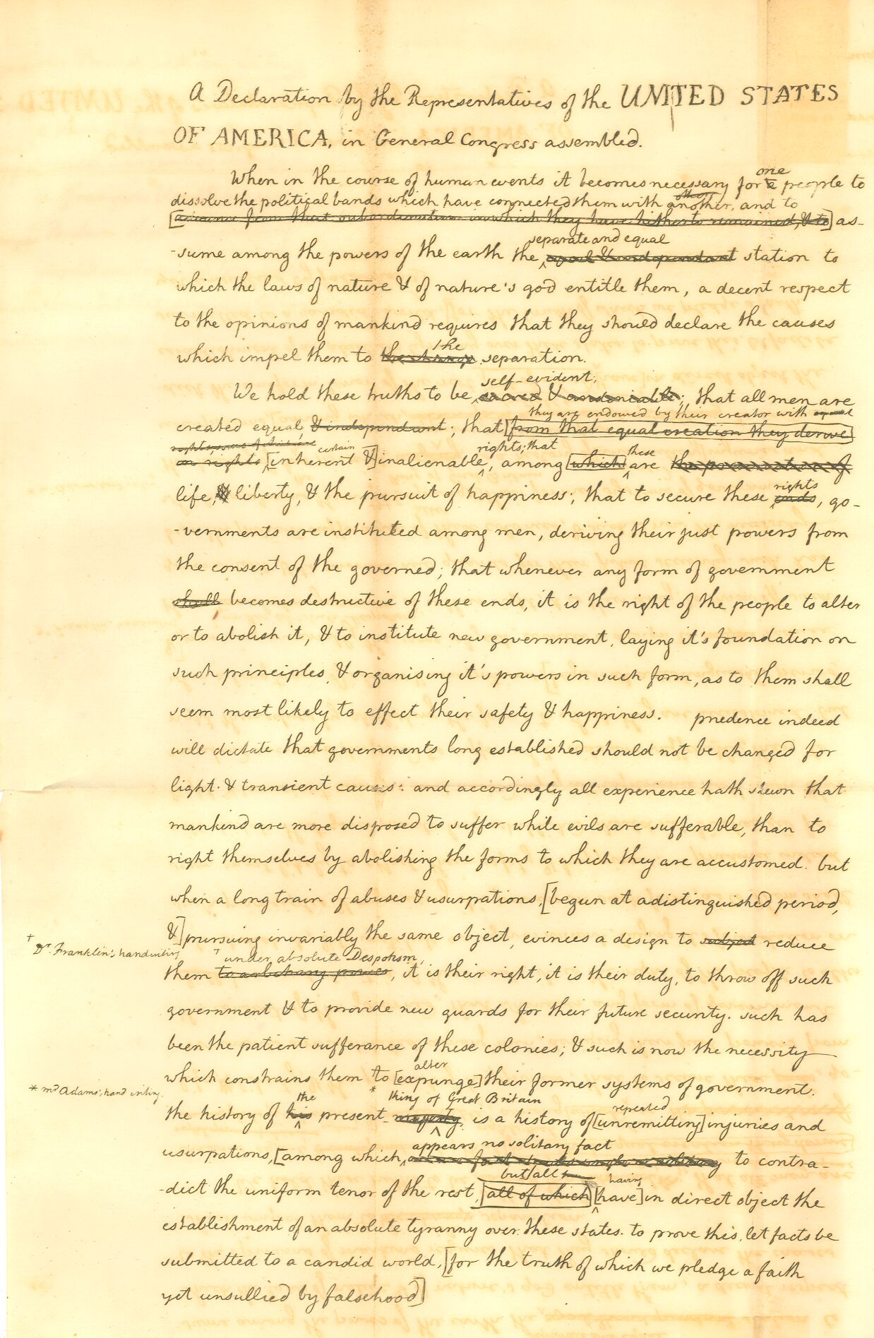 We hold these truths to be self-evident, that all men are created equal, that they are endowed by their Creator with certain unalienable Rights, that among these are Life, Liberty, and the pursuit of Happiness. That to secure these rights, Governments are instituted among Men, deriving their just powers from the consent of the governed, That whenever any Form of Government becomes destructive of these ends, it is the Right of the People to alter or to abolish it, and to institute new Government, laying its foundation on such principles and organizing its powers in such form, as to them shall seem most likely to effect their Safety and Happiness. Prudence, indeed, will dictate that Governments long established should not be changed for light and transient causes; and accordingly all experience hath shown, that mankind are more disposed to suffer, while evils are sufferable, than to right themselves by abolishing the forms to which they are accustomed. But when a long train of abuses and usurpations, pursuing invariably the same Object evinces a design to reduce them under absolute Despotism, it is their right, it is their duty, to throw off such Government, and to provide new Guards for their future security. —Such has been the patient sufferance of these Colonies; and such is now the necessity which constrains them to alter their former Systems of Government. The history of the present King of Great Britain is a history of repeated injuries and usurpations, all having in direct object the establishment of an absolute Tyranny over these States. To prove this, let Facts be submitted to a candid world.