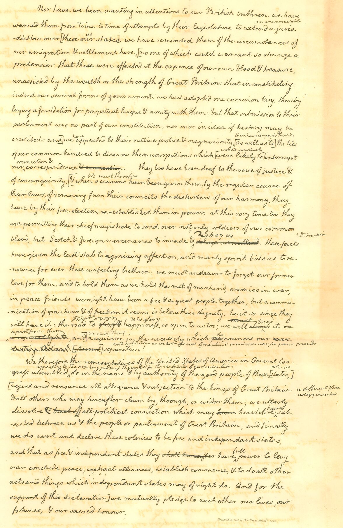 We, therefore, the Representatives of the United States of America, in General Congress, Assembled, appealing to the Supreme Judge of the world for the rectitude of our intentions, do, in the Name, and by the Authority of the good People of these Colonies, solemnly publish and declare, That these United Colonies are, and of Right ought to be Free and Independent States; that they are Absolved from all Allegiance to the British Crown, and that all political connection between them and the State of Great Britain, is and ought to be totally dissolved; and that as Free and Independent States, they have full Power to levy War, conclude Peace, contract Alliances, establish Commerce, and to do all other Acts and Things which Independent States may of right do. And for the support of this Declaration, with a firm reliance on the Protection of Divine Providence, we mutually pledge to each other our Lives, our Fortunes and our sacred Honor.
