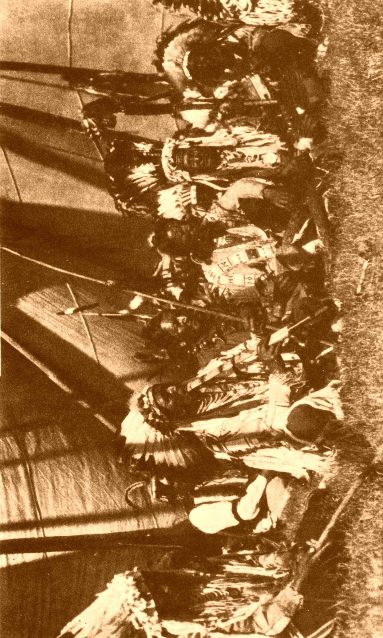 After these and other eminent chiefs had made reply to the address of welcome given by Chief Plenty Coups, according to Indian custom they were all seated in rows on the ground in semicircles, the more eminent chiefs in the first row, the lines falling back until they reached the wall line of the lodge. Every chief wore his full war regalia and carried with him all of his ceremonial and sacred insignia. The small army of [pg 197] coup sticks, always held aloft, presented a suggestive picture, for these coup sticks of the many chiefs from many lands each told a story of struggle and achievement, but in the speeches made by the chiefs each coup stick was to become a pledge of peace.