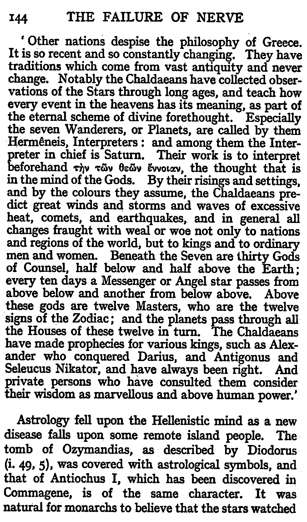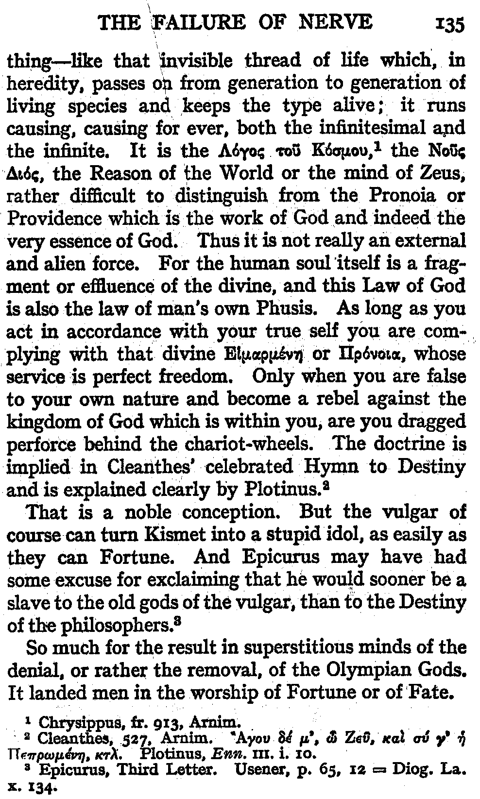 The title of the third essay I owe to a conversation with Professor J. B. Bury. We were discussing the change that took place in Greek thought between, say, Plato and the Neo-Platonists, or even between Aristotle and Posidonius, and which is seen at its highest power in the Gnostics. I had been calling it a rise of asceticism, or mysticism, or religious passion, or the like, when my friend corrected me. 'It is not a rise; it is a fall or failure of something, a sort of failure of nerve.'—We are treading here upon somewhat firmer ground than in the first two essays. The field for mere conjecture is less: we are supported more continuously by explicit documents. Yet the subject is a very difficult one owing to the scattered and chaotic nature of the sources, and even where we get away from fragments and reconstructions and reach definite treatises with or without authors' names, I cannot pretend to feel anything like the same clearness about the true meaning of a passage in Philo or the Corpus Hermeticum that one normally feels in a writer of the classical period. Consequently in this essay I think I have hugged my modern authorities rather close, and seldom expressed an opinion for which I could not find some fairly authoritative backing, my debt being particularly great to Reitzenstein, Bousset, and the brilliant Hellenistisch-römische Kultur of [xvi]P. Wendland. I must also thank my old pupil, Mr. Edwyn Bevan, who was kind enough to read this book in proof, for some valuable criticisms. The subject is one of such extraordinary interest that I offer no apology for calling further attention to it.
