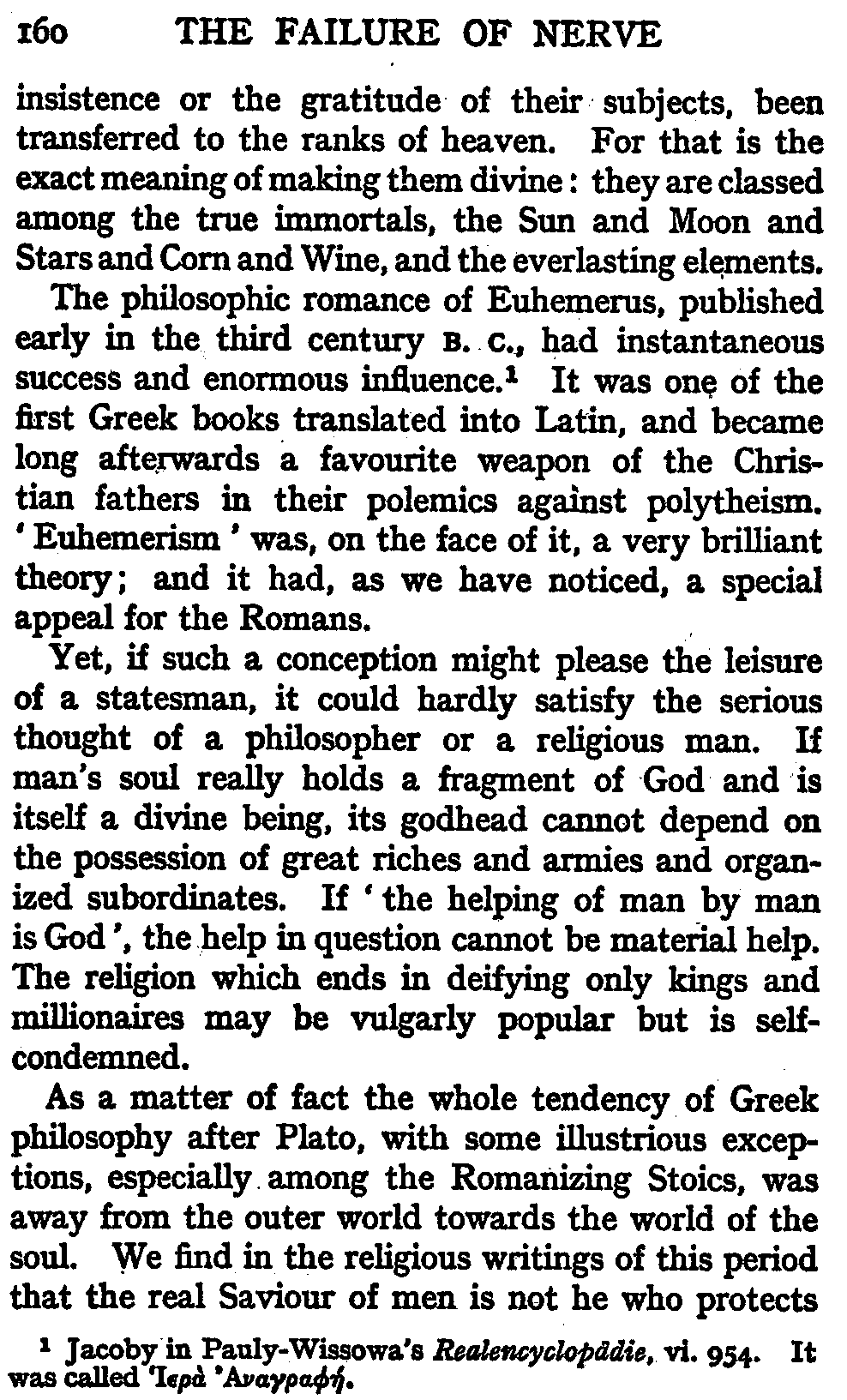 The old Third Stage, therefore, becomes now a Fourth, comprising the later and more popular movements of the Hellenistic Age, a period based on the consciousness of manifold failure, and consequently touched both with morbidity and with that spiritual exaltation which is so often the companion of morbidity. [4]It not only had behind it the failure of the Olympian theology and of the free city-state, now crushed by semi-barbarous military monarchies; it lived through the gradual realization of two other failures—the failure of human government, even when backed by the power of Rome or the wealth of Egypt, to achieve a good life for man; and lastly the failure of the great propaganda of Hellenism, in which the long-drawn effort of Greece to educate a corrupt and barbaric world seemed only to lead to the corruption or barbarization of the very ideals which it sought to spread. This sense of failure, this progressive loss of hope in the world, in sober calculation, and in organized human effort, threw the later Greek back upon his own soul, upon the pursuit of personal holiness, upon emotions, mysteries and revelations, upon the comparative neglect of this transitory and imperfect world for the sake of some dream-world far off, which shall subsist without sin or corruption, the same yesterday, to-day, and for ever. These four are the really significant and formative periods of Greek religious thought; but we may well cast our eyes also on a fifth stage, not historically influential perhaps, but at least romantic and interesting and worthy of considerable respect, when the old religion in the time of Julian roused itself for a last spiritual protest against the all-conquering 'atheism' of the Christians. I omit Plotinus, as in earlier chapters I have omitted Plato and Aristotle, and for the same reason. As a rule in the writings of Julian's circle and still more in the remains of popular belief, the tendencies of our fourth stage are accentuated by an increased demand for definite dogma and a still deeper consciousness of worldly defeat.