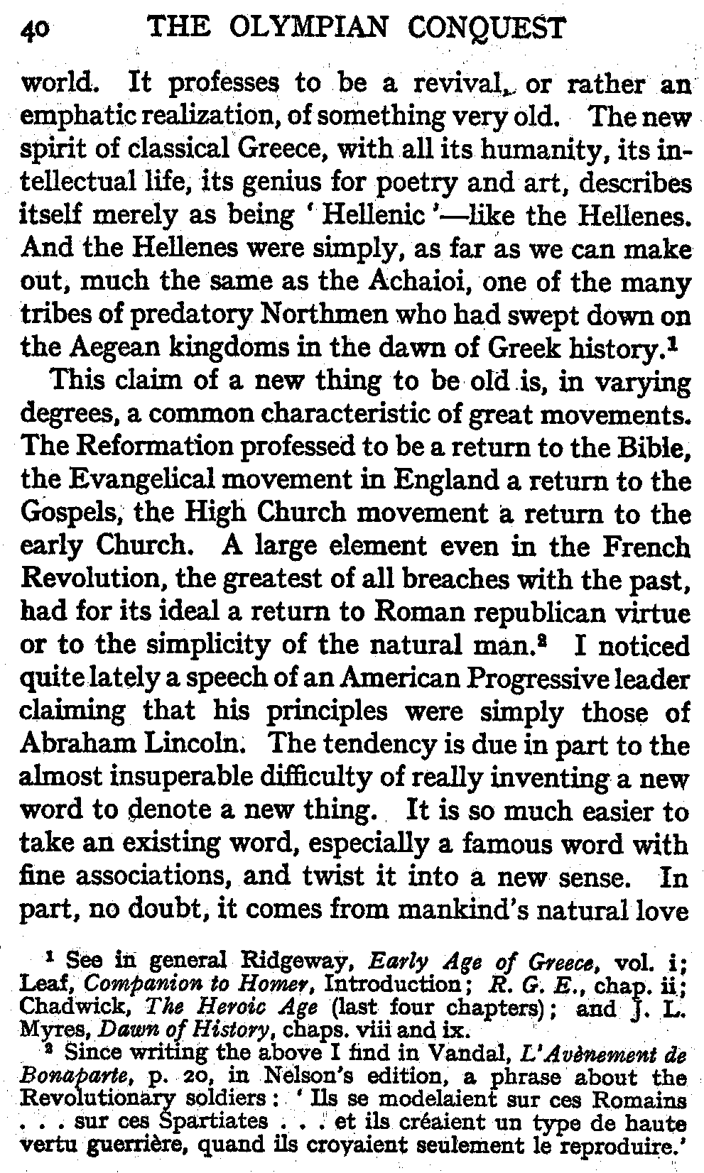 The second may also be said to have grown out of Miss Harrison's writings. She has by now made the title of 'Olympian' almost a term of reproach, and thrown down so many a scornful challenge to the canonical gods of Greece, that I have ventured on [xv]this attempt to explain their historical origin and plead for their religious value. When the essay was already written I read Mr. Chadwick's impressive book on The Heroic Age (Cambridge, 1912), and was delighted to find in an author whose standpoint and equipment are so different from mine so much that confirmed or clarified my own view.