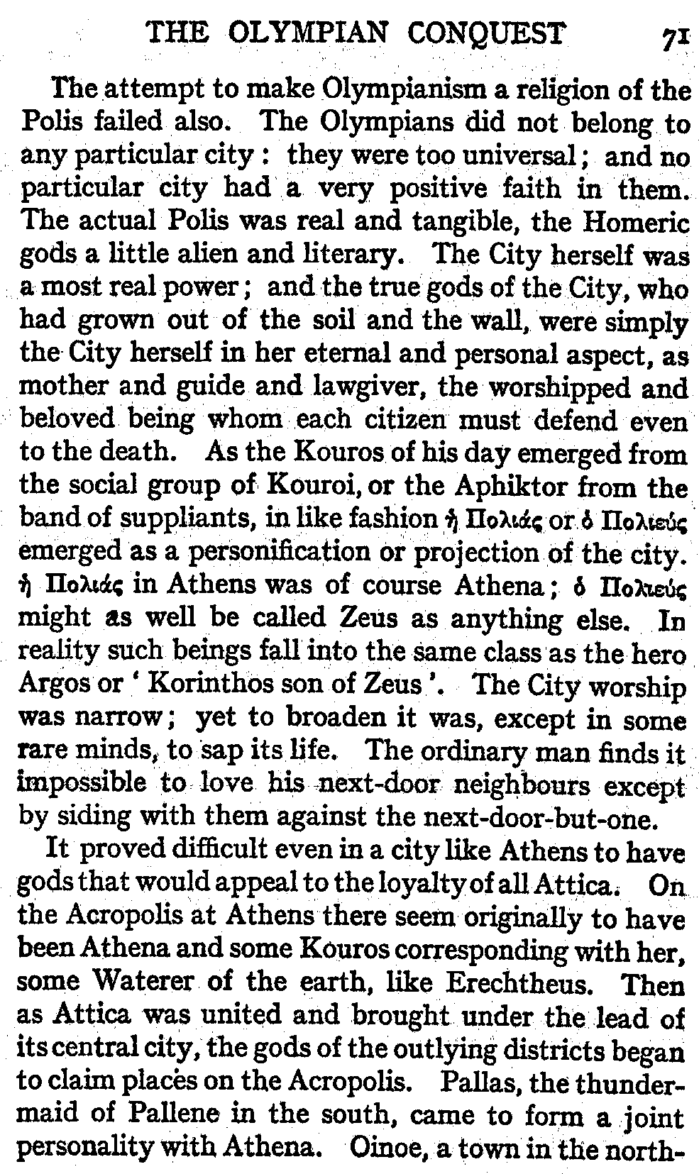 To turn to our immediate subject, I wish to put forward here what is still a rather new and unauthorized view of the development of Greek religion; readers will forgive me if, in treating so vast a subject, I draw my outline very broadly, leaving out many qualifications, and quoting only a fragment of the evidence.