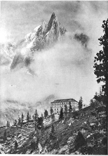 Sallanches est, avec le site délicieux de Combloux récemment aménagé par la Compagnie des chemins de fer P.L.M., un des points les plus favorables d'où l'on puisse embrasser le massif du Mont-Blanc dans son ensemble. La cime [Pg 17] apparaît encadrée par les gigantesques sommets qui lui font un merveilleux cortège. A gauche, c'est l'entassement prodigieux des Aiguilles proprement dites; à droite se succèdent, harmonieusement espacés, les sommets plus majestueux du Dôme et de l'Aiguille du Goûter, les Aiguilles de Bionnassay, de Miage et de Trelatête.