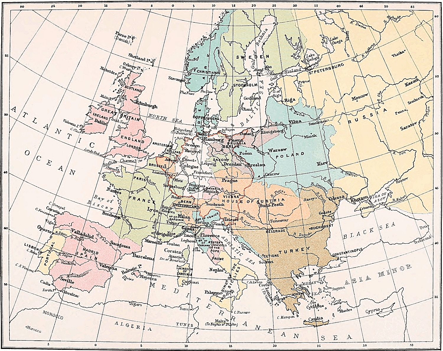 | The Congress of Vienna—Monarchs and Diplomatists present—History of the Congress—Treaty between France, Austria, and England—The Questions of Saxony and Poland—The German Confederation—Disposition of the provinces on the left bank of the Rhine—Mayence and Luxembourg—Reconstitution of Switzerland—Rearrangements in Italy—Questions of Murat, Genoa, and the Empress Marie Louise—Sweden—Denmark—Spain—Portugal—England’s share of the spoil—The Questions of the Slave Trade and the Navigation of Rivers—Close of the Congress—Preparations against Napoleon—The first reign of Louis XVIII. in France—Napoleon’s return from Elba—The Hundred Days—The Campaign of Waterloo—Occupation of Paris—Second Treaty of Paris—Napoleon sent to St. Helena—The Holy Alliance—Return of xviLouis XVIII.—Government of the Second Restoration—The Chambre Introuvable—Reaction in Spain and Naples—Territorial Results of the Congress of Vienna—The Principle of Nationality—Permanent Results of the French Revolution in Europe—The Problem of harmonising the Principles of Individual and Political Liberty with that of Nationality, | 336 |
