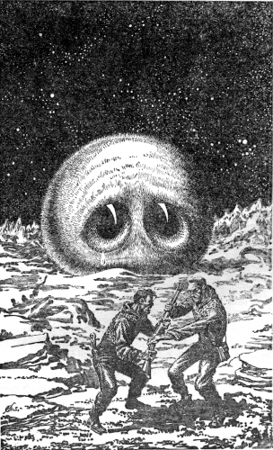 The two men stared grimly at a motionless purple sphere, about eight feet in diameter, that rested fifty feet from the damaged rocket. On the surface of the sphere were two huge, sad eyes that watched the rocket ship with melancholy attention.