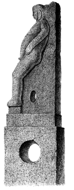 Female, sitting with straight arms, the hands pressed against the stone seat in a posture just able to sustain the pressure of a heavy load. The head was wanting, but the well marked posture, as compared with that of the just described figure, seems to justify the conclusion that [Pg 29] this figure has also supported upon its head the large head of some animal. The entire figure was heavy and clumsy, but the circumstance of the muscles of the body being indicated both in front and behind, makes it not improbable that this statue has stood insulated, like K. The arms were quite detached from the body, and uncommonly thick and heavy, as were also the legs. The hands were heavily pressed against the block, on which the figure was seated, the right hand with the palm, the left one with the knuckles. The most remarkable feature of this statue was perhaps the bench on which it was seated; this was cut out from the block so as to be quite free and detached. The statue, like all above described ones, was sculptured from a single block, a monolith. The height of the statue from the shoulders to the upper edge of the pedestal was 107 cm. The breadth across the shoulders was 69 cm. It was found pretty close to the mound 4.