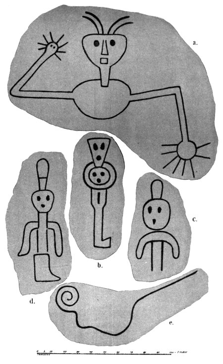 With the exception of the meagre notices, communicated by Oviedo and Cerezeda and their compilers, the source of our knowledge of Nicaraguan antiquities is E. G. Squier’s interesting work «Nicaragua: its people, scenery, monuments and the proposed interoceanic canal». After Squier some other American investigators have followed in the road opened by him; Dr. Earl Flint of Rivas has during many years searched for and collected antiquities, partly in the Department of Rivas, partly in the island of Ometepec. I am obliged to Dr. Flint for much valuable information on the present subject, kindly communicated to me, when I had the pleasure of meeting with him at Rivas in January 1883. He has sent the collections gradually brought together by himself, to the Smithsonian Institution. In «Archæological researches in Nicaragua»[4] Dr. J. F. Bransford gives a highly interesting description of his researches in Ometepec, where he made a large collection of grave-urns, other vessels of pottery, and smaller relics of stone and metal. He occupied himself principally in investigating burying-places on the west side of the island and he has thrown a new light on this part of Niquiran archæology. His very large collection, of 788 numeros, is deposited in the collections of the Smithsonian Institution in Washington. He has also figured several rock-carvings from Ometepec; these seem to be a little ruder and less complicated than those delineated by me from the island of Ceiba. [Pg 9] Dr. Bransford also describes several ancient relics from Talmac, San Juan del Sur in the department of Rivas, and some localities in Nicoya, in the republic of Costa Rica. From a linguistic point of view Dr. Berendt[5] has given very valuable contributions to our knowledge of the ancient civilisation of Nicaragua by his sharp-sighted and successful investigations into the Indian idioms of that country and into those of Mexico and of the northern parts of Central America.