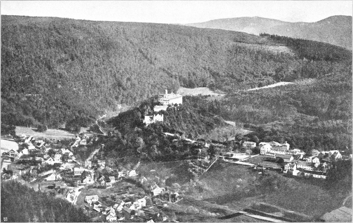 Die drei Schlösser (Abb. 16), umgeben von üppigen Gärten, gewähren reizvolle Blicke ins Saalthal und in die Landschaft. Goethe hat hier oft geweilt, um Ruhe und Frieden zu suchen, und schilderte mit warmer Empfindung den Ausblick ins Thal: