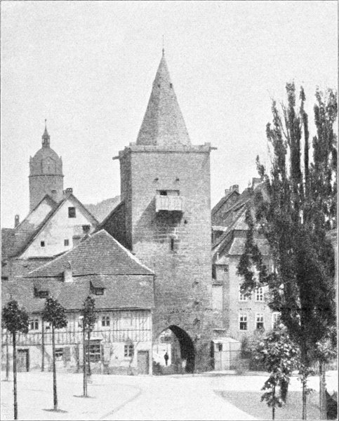 Unsere Abbildungen 18 und 19 zeigen die Veränderungen des Stadtbildes in 300 Jahren, für welche die Hochschule von erheblicher Bedeutung wurde. Die Universität, von Johann Friedrich dem Großmütigen gestiftet, wurde 1558 eingeweiht und erfreut sich noch heute einer dauernden Blüte, obwohl sie am Ende des XVIII. Jahrhunderts einen dreimal größeren Studentenbesuch[S. 25] hatte; die Bibliothek umfaßt 220000 Bände. An vielen Häusern erzählen uns kleine Gedenktafeln von den Geistesgrößen, die da gewohnt und gelehrt haben. Arndt, Schelling, Fichte, Goethe, der oft hier weilte, und vor allem Schiller, der 1789 als Professor der Philosophie und Geschichte nach Jena berufen wurde und hier 10 Jahre blieb. Im ehemaligen Schillerschen Garten erhebt sich jetzt die neue Sternwarte und eine Büste des Dichters, daneben steht auf einem Granitblock die Inschrift: Hier schrieb Schiller den Wallenstein 1798. Die Stadt- oder Michaeliskirche, 1301 eine Niederlassung des Cistercienser-Nonnenklosters in Roda, ist eine der größten Kirchen Thüringens. Ein mit der Studentenschaft in enger Verbindung stehendes Haus ist der Burgkeller (Abb. 20), um 1546 in derber Hochrenaissance erbaut. In die fröhliche Studentenzeit zurück führt die Bezeichnung der sieben Wunder Jenas: ara (Durchgang unter dem Altar der Stadtkirche), caput (der Schnapphans an der Rathausuhr), draco (von Studenten im XVII. Jahrhundert zum Scherz zusammengestelltes skelettartiges Gebilde), mons (der Hausberg), pons (die Camsdorfer Brücke), vulpecula turris (der Fuchsturm), Weigeliana domus (das Weigelsche Haus in der Johannisgasse, jetzt abgebrochen). Als die jugendlichen Kämpfer der Musenstadt aus den Freiheitskriegen zu ihren Studien zurückkehrten, gründeten sie zu warmer Pflege der Vaterlandsliebe die Burschenschaft, die ihnen in den nächsten Jahren so viele Verfolgungen bringen sollte. Zur Erinnerung daran wurde 1883 das Burschenschaftsdenkmal (Abb. 21) errichtet, ein Student in der Tracht von 1817, Fahne und Schwert haltend, ein schönes Marmorwerk von Donndorf. Industriell bedeutend ist die optische Werkstatt von Zeiß, die einschließlich der Glashütte über 1000 Arbeiter beschäftigt und eine der ersten Anstalten dieser Art in Deutschland ist.