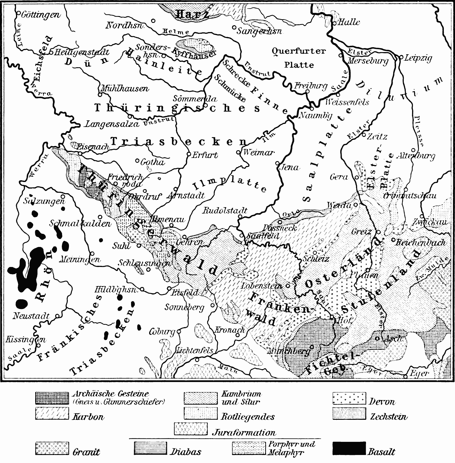 Ungefähr ein Dreieck mit den Spitzen Saalfeld, Hof und Altenburg schließt das Osterländische oder Vogtländische Stufenland ein, das sich nach Norden zum oben beschriebenen Saalfeld-Neustädter Zechsteingürtel, sowie nach Osten zum Elsterthale hin langsam abdacht. Es ist das alte Grenzgebiet gegen das Königreich Sachsen hin und zeigt von den altpaläozoischen Schichten aufwärts bis zum Kulm eine bedeutende Faltung, vorzugsweise in der Richtung von Südwest nach Nordost. Das ganze Gebiet ist eine plateauartige Hügellandschaft, zerschnitten von einer großen Zahl weit verzweigter Thäler, die nur in den tiefen Einschnitten der Elster, Göltzsch und Weida einen gebirgigen Eindruck hervorrufen. Der Haupterhebungssattel dieses ostthüringischen Gebietes ist ein Kambriumstreifen, der sich in einer Breite von 8–11 km von Südwest nach Nordost erstreckt, hier aber unter das Rotliegende des Erzgebirgischen Beckens untertaucht, nach Südwesten sich aber fortsetzt bis zur oberen Saale. Parallel zu diesem Hauptsattel steigt der weiter im Südosten gelegene Erzgebirgische Hauptsattel, und zwischen beiden liegt die etwa 11 km breite Vogtländische Hauptmulde, in welcher besonders devonische Ablagerungen vorhanden sind. Auch sie taucht nach Nordosten unter das Erzgebirgische Becken unter, ist jedoch südwestlich noch weiter zu verfolgen. Nordwestlich aber vom Ostthüringischen Hauptsattel liegt die Ostthüringische Hauptmulde, wo die tiefsten Schichten dem sich breit ausdehnenden Oberkulm angehören. Nordwärts wird diese Mulde von dem am Rande des Thüringischen Beckens ausstreichenden Zechstein und Buntsandstein überdeckt. Nordöstlich von Ziegenrück bestehen zahlreiche flache Mulden, in denen sich Wasser ansammelt, da der Boden durch Thonschichten undurchlässig ist. Daher erfreut sich das Auge hier an Hunderten von hell schimmernden Teichen, die mit ihrer teilweisen Waldumrandung der Landschaft einen um so größeren Reiz verleihen, als Thüringen und besonders sein Gebirgsland sonst arm an stehenden Gewässern ist. Merkwürdig sind auf der Strecke Burgk-Schleiz-Zeulenroda-Weida-Ronneburg-Altenburg Diabasdurchbrüche, die der Landwirtschaft nicht nutzbar sind, wenn sie mitten im urbar gemachten Boden vorkommen, und meist mit Eichen, Buchen und anderem[S. 35] Laubholz bewachsen sind. Im Nordosten von Gera nach den Flußthälern der Sprotte und Schnauder hin verliert sich allmählich das alte Gebirge, und es beginnt der fruchtbare Ackerboden des altenburgischen Ostkreises, der dann hinüberleitet in die Tieflandschaften der Sächsisch-Thüringischen Bucht.