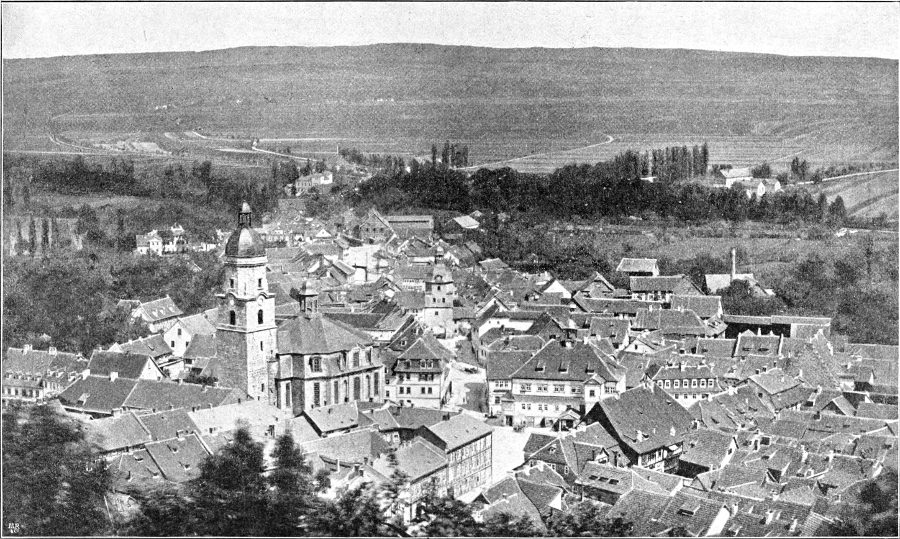 Wo die Gewässer des Gebirges südwärts fließen, breitet sich in hellem Duft das Werrathal aus, geziert von mancher lebensfrohen Stadt. Auch hier grüßen von den Vorbergen altersgraue Rittersitze, und am glänzenden Flusse ragen verlassene Klosterhallen empor, bekränzt vom dunklen Epheu oder vom wilden Wein, aber vom verfallenen Turme läutet frommen Wallfahrern keine Glocke mehr. Dort dehnen sich die geschichtsreichen und doch heute so stillen Gelände des alten Grabfeldgaues. Im Südosten aber ragt die schöne kleine Hauptstadt aus üppigen Gärten mit ihrem Kranze von Bergen und Burgen, die hinüberschauen in die blühenden Gefilde des Mainthals.