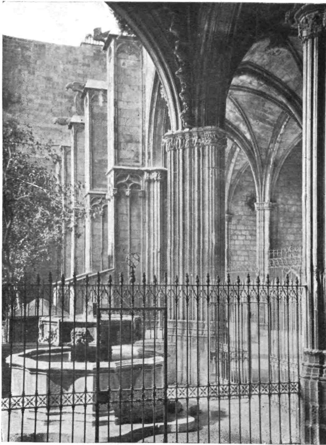 Barcelona is richer in monuments of the past than many a more ancient-looking city. Foremost among these is the Cathedral in the very heart of the town, one of the grandest examples of Gothic architecture in Spain. Its extreme sombreness and apparently massive character produce a similar impression to that created by the much larger Cathedral of Seville.