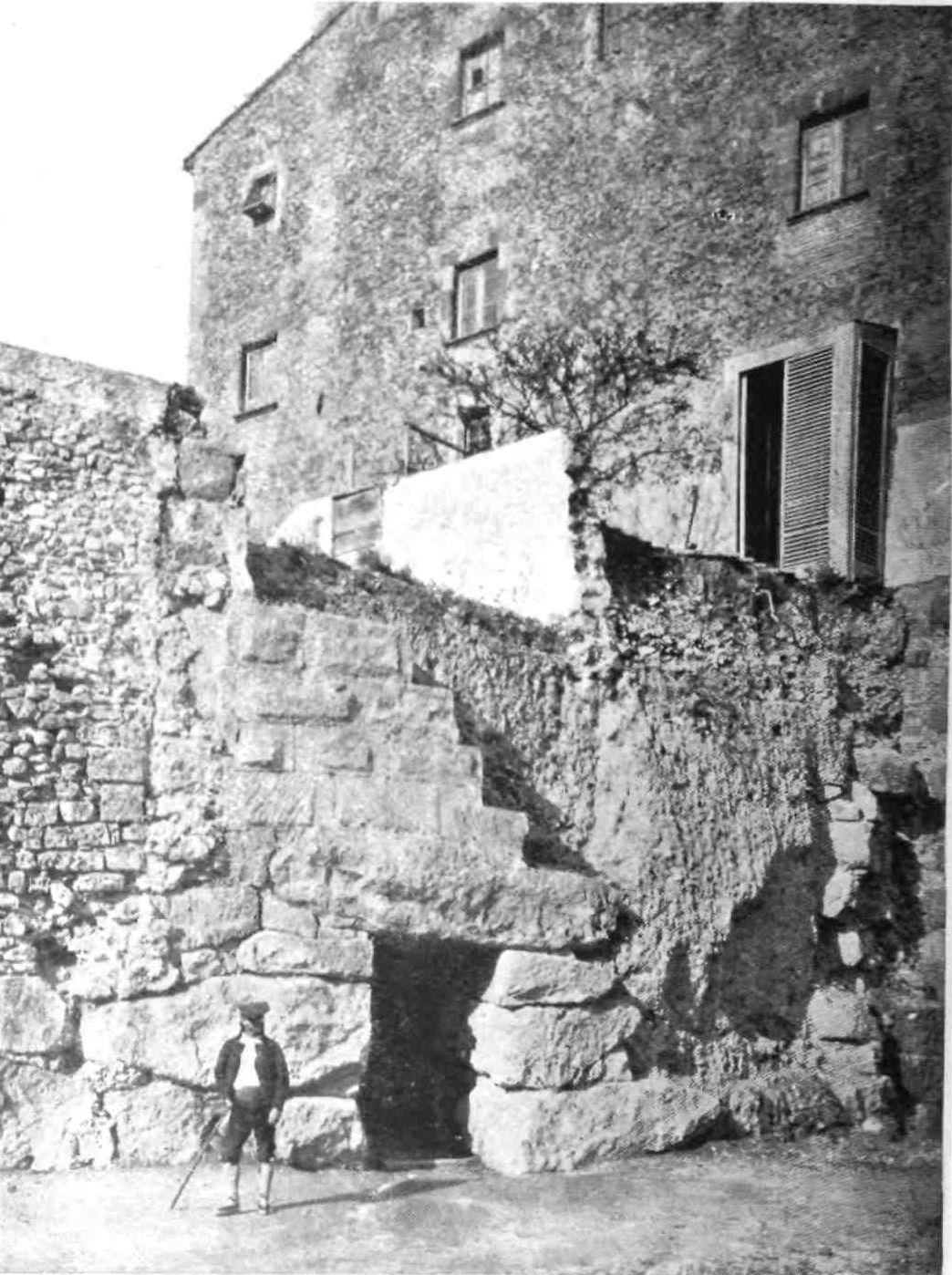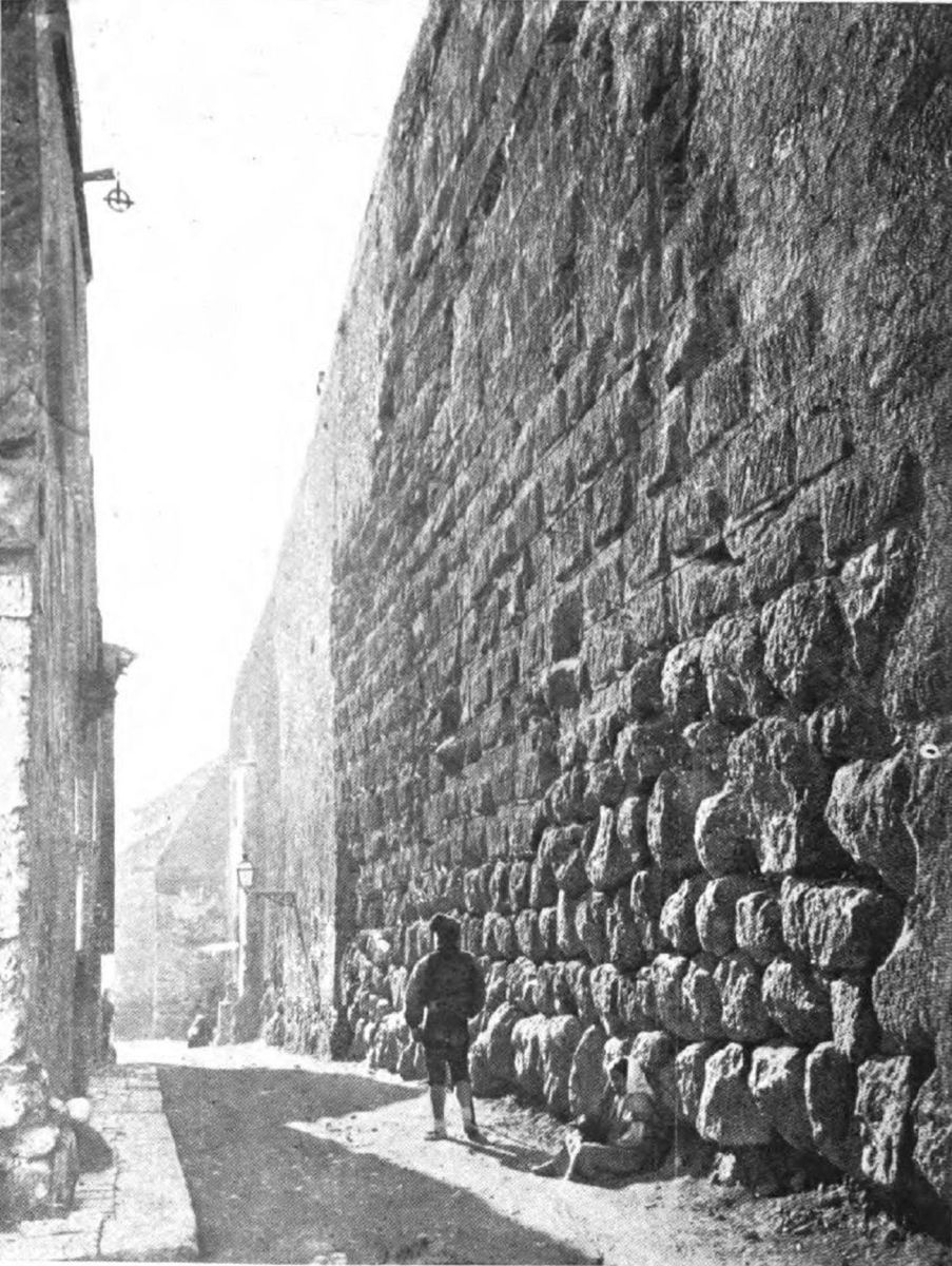 These edifices apart, the Middle Ages have done little for Tarraco togata. Its remaining monuments belong to its infancy and prime. The Cyclopean walls, now declared a national monument, extend from near the Puerta del Rosario to the crest of the hill on which the city stands, and thence to the eastern angle of the ancient prætorium, now converted into a prison. The base of this wall is formed by huge blocks of unhewn stones, uncemented, and with their interstices filled by smaller stones. The character of the work bespeaks the primitive nature of the builders. On this rude foundation rests the more regular work of the Roman conquerors. The enceinte formed by these walls is of the shape of an irregular polygon, measuring three-quarters of a mile across, and open on one side. The angles are defended by square towers, and the curtains are pierced by gates, to some of which the name “Puerta ciclopea” is given. The{60} Puerta del Rosario, called in the Middle Ages “Portal de Predicadors,” is about eight yards thick and is roofed by an enormous block of stone about 36,000 kilogrammes in weight. On the stones composing the Roman part of the wall, Iberian letters are traced. These were merely masons’ marks for the guidance of the native workmen, and form no words. The Torre del Arzobispo was raised in Christian times on the old Roman tower. The wall extending to the Torre del Capiscol is attributed to the Scipios, and dates in any case from their time. The principal Roman gate, called the Puerta del Socarro, is a noble work formed by three concentric arches. Passing through this we obtain a fine view of the strip of wall built by order of Hadrian, and may re-enter the city by the eighteenth-century gate of San Antonio, which pierced a wall built or restored by Norman adventurers in the twelfth century.