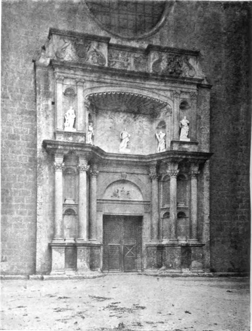The transept doors are also very fine, especially the southern one. The cornice is beautifully sculptured and the wheel window above reveals in its details the influence of the Italian Romanesque. These entrances make us regret the effacement of the west porch, which is concealed by the vast square cloister covering that side of the church. This remarkable building, now occupied by troops, is the grandest, Street declared, he had ever seen. In its present desecrated state, it must be confessed it needs a highly trained eye to appreciate its beauty. The arcades are walled up, and there is some ground for supposing that when in ecclesiastical occupation the galleries were used as dormitory and refectory. The details vary greatly. The bays vary in width, the sculpture is of all sorts of design, and of all periods. Adjoining this vast cloister on the north side is a long barrel-vaulted hall, lighted only at one end. On{45} the west side the cloister is entered through an enormous western doorway with a pointed arch. South of this and almost detached from the cloister stands that beautiful octagonal steeple which served Pedro Balaguer as a model for the Micalet Tower at Valencia. It is 170 feet high and divided into five stages, “the whole construction being of the most dignified and solid description.”
