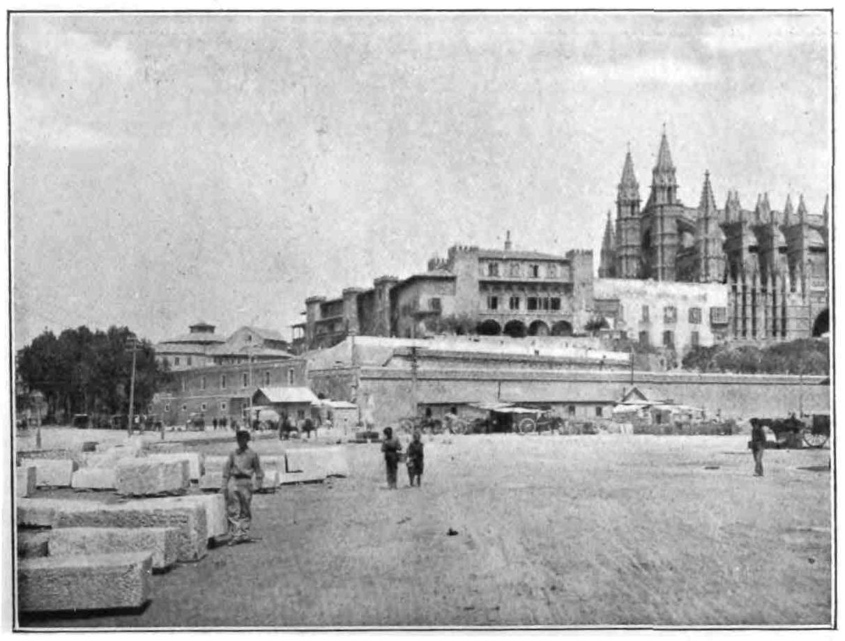 The cathedral towers above the whole city and{92} is one of the most important churches in the kingdom. The name of the architect is unknown, but the foundations were laid by order of Jaime the Conqueror soon after he had annexed the island. The plan is rectangular, the walls supported by massive flying buttresses, surmounted with pinnacles and turrets. The south front is the finest and is pierced by the beautiful Puerta del Mirador, in florid Gothic style, the work of Pedro Morey, who died in 1394. The west porch is an elaborate work, finished in 1601. On the north side is the noble square bell-tower.