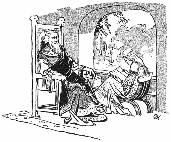 En dienzelfden dag, na den maaltijd, begaf de koning zich naar zijn studeervertrek, waar de boeken in lange rijen stonden en waar Wanda elken avond haar vader voorlas. Maar nu liet hij zijn zoons weten, dat hij hen [11]te spreken verlangde en gezeten in zijn hoogen leunstoel, waar het licht der ondergaande zon juist op hem viel, vertelde hij aan Perlus en Urlo wat hij gedroomd had en wat de ministerraad besloot.