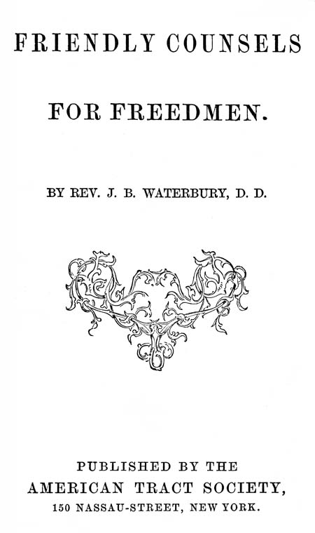 Be chaste. I dare say you know what that means. Whatever bad examples you may have had, you should now and henceforth keep from that destructive vice which God has forbidden in the seventh commandment. It is, “Thou shalt not commit adultery.” This means, to keep to your own wife, and the wife keep to her own husband. If you break over this bound, you break God’s law. In slavery, this vice or wickedness has not been thought so very bad; and perhaps, in some instances, it may even have been encouraged. But it was wicked then, and it is wicked now. Whatever apologies you may have made for it before, you are now out of the house of bondage, and under the same laws that all are. A[15] woman’s character, married or unmarried, is blasted if she is impure; and in the sight of God an impure man is equally sinful.