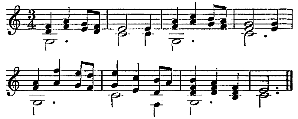 (5) In addition to the dance measure, Haydn has adopted other instrumental forms, e.g., marches, bag-pipe melodies, and the like. Here is one, with a strange rhythm, from the Pianoforte Scherzando in F major:— [Pg 56]