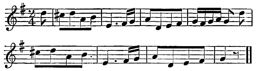 (4) These latter examples do not imply reminiscences, but at most a general sympathy of temper. A good deal more, however, is involved in the treatment of Slavonic dance tunes. It is hardly too much to say that what the Csardas was to Liszt the Kolo was to Haydn; with this difference—that the earlier and greater musician has throughout made a finer use of his materials. The Kolo is a Slavonic measure, which I have seen the children dance at Agram and the men at Sarajevo, bright [Pg 50] and cheery of movement, its tune in two-four time ingeniously varied by patterns of quaver and semiquaver figures. Here, for instance, is an example well known in Bosnia and Dalmatia:—