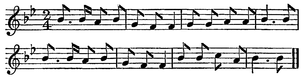 (3) There are several cases in which, without direct adaptation, Haydn has shown the same tendency of thought or phrase as the Slavonic folksongs. A favourite “curve” of his may be illustrated by the opening of the B♭ Symphony (Salomon, No. 9)—