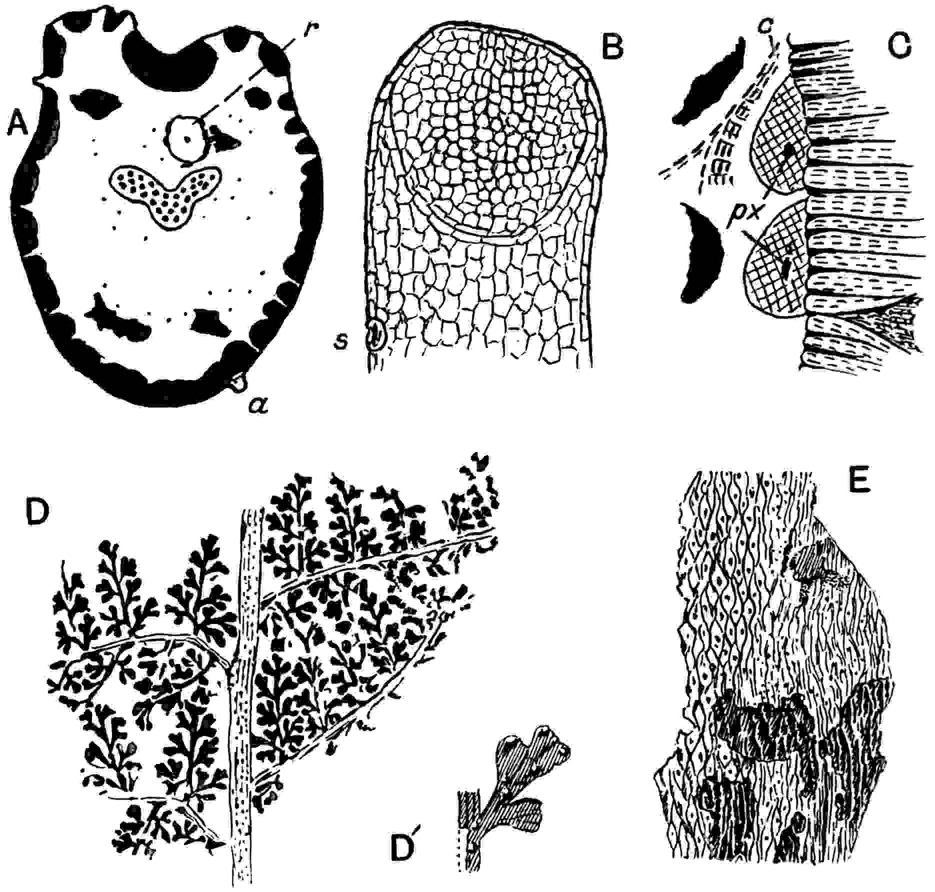 The pinna shown in fig. 624 from the Jurassic beds in Yorkshire[1737] is interesting as one of the few examples of the preservation of the cuticular membrane. The straight or curved walls of the epidermal cells agree with those of recent Cycads except Stangeria, and each cell bears a large central papilla that gives to the lamina the finely punctate appearance which has been regarded as evidence of sporangia. The gaps in the cuticle probably mark the position of sunken stomata.