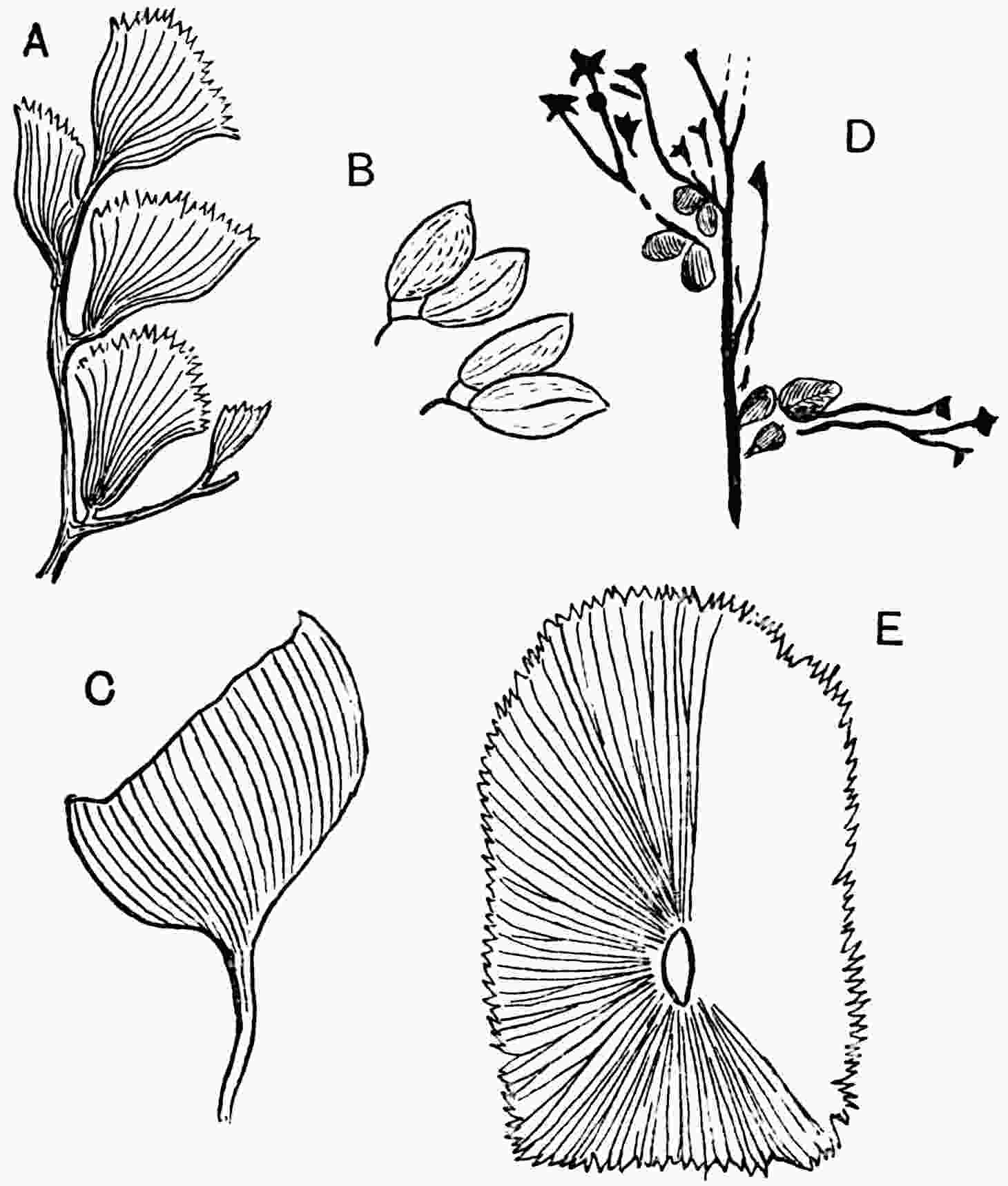 Linear fronds varying considerably in breadth and in the degree of dissection of the lamina, which may be entire; the margin may show broad and shallow crenulations or there may be a few narrow and deep sinuses cutting the otherwise entire lamina into long and narrow segments. More usually the lamina is divided to the rachis into numerous truncate segments traversed by parallel, simple, veins extending from a narrow groove in the middle of the rachis on the upper surface of the frond (fig. 619, E). The veins run in very narrow grooves in the generally flat but occasionally corrugated lamina[1670].
