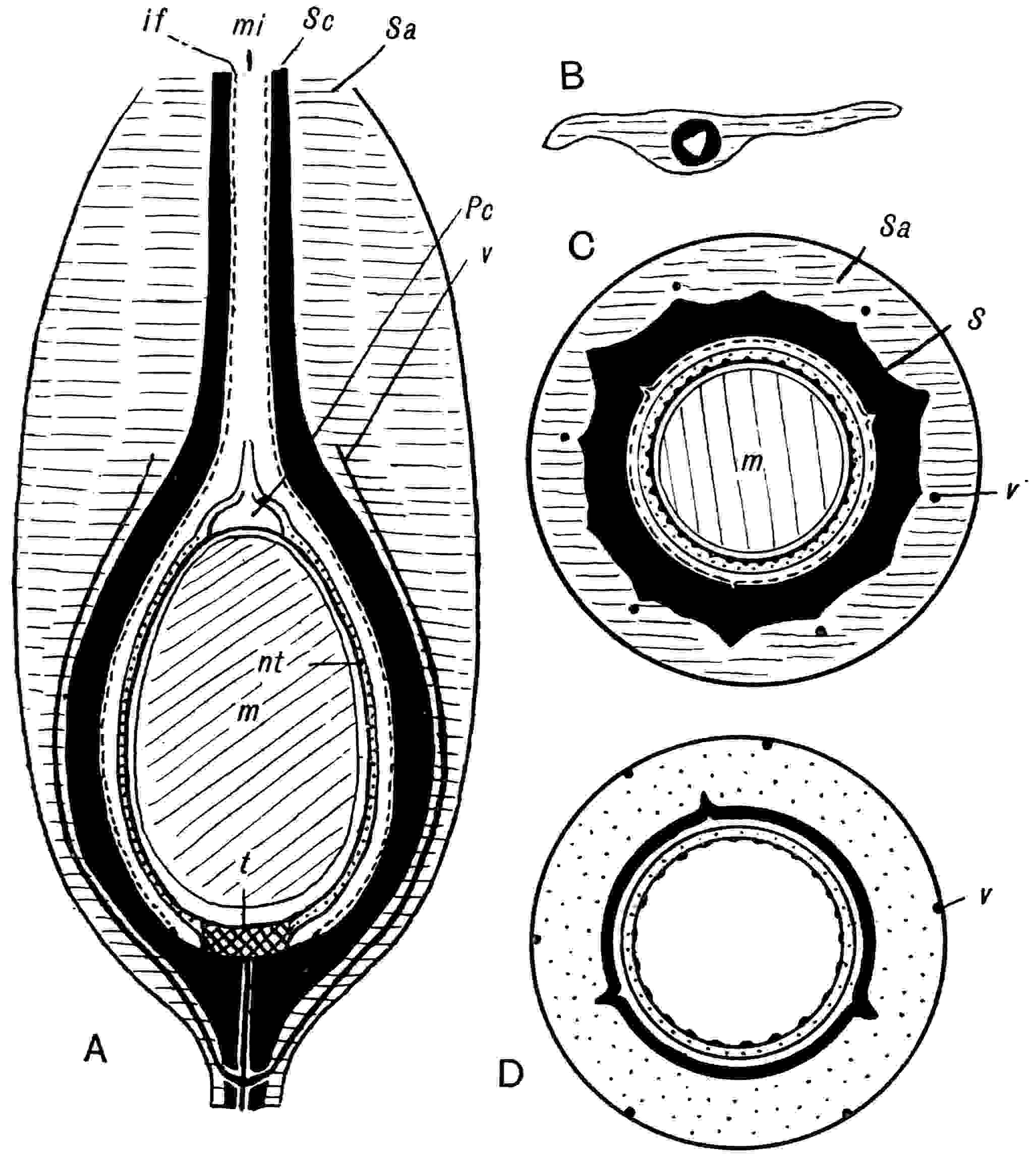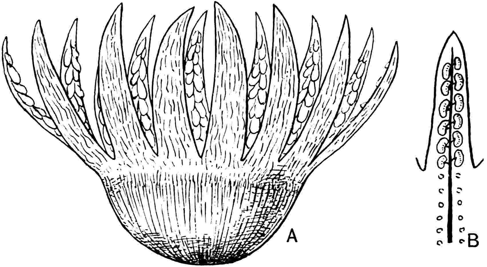 A Rhaetic Scanian species originally referred by Nathorst[1678] to Nilssonia but later removed by him to Dioonites[1679] and in 1909 reinstated in Nilssonia[1680] on the ground that the lamina covers the upper face of the rachis. The segments are fairly uniform in breadth and linear; they reach 10 cm. in length and are usually 5–7 mm. broad; the lamina is slightly tapered towards the apex (fig. 619, B). There are 3–10 parallel grooves on the upper 573face of the segments and between each pair is a single unbranched vein. In close association with portions of three fronds of this species Nathorst found several oval bodies, 1 cm. × 7 mm., which he at first regarded as ‘antherangia’ comparable with the sporocarps of the Hydropterideae, but an examination of the carbonised tissue demonstrated that the small rounded bodies contained in each of the ‘antherangia,’ originally believed to be pollen-sacs, are grains of resin internal to a cuticle of thick-walled cells and probably formed by secretory sacs in a fleshy tissue. Internal to the resin-bodies is a second cuticle which may be the remains of a nucellus, the outer cuticle and the resin belonging to the sarcotesta. Nathorst’s careful examination of these fossils shows that they are seeds (fig. 619, A) and were probably borne on plants of N. pterophylloides, though an accidental association is not improbable.
