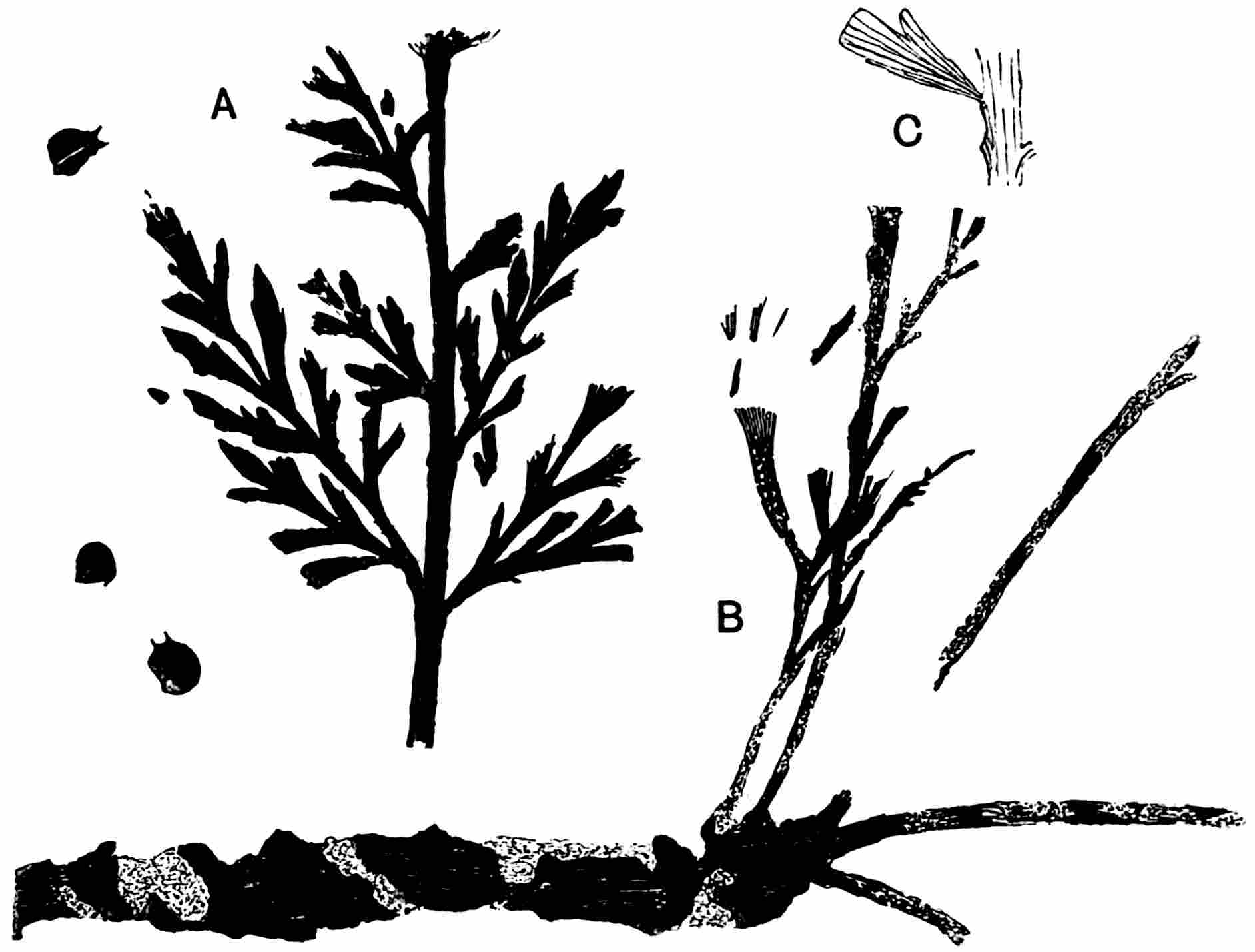 This Rhaetic species from Tonkin[1616] and Persia[1617] is interesting as affording an example of a frond with exceptionally narrow and contiguous pinnae. The frond is narrow and lanceolate, 15–20 cm. long with pinnae normal to the rachis, ·5–1 mm. broad and 7–25 mm. long attached by the whole base which is sometimes slightly enlarged. The veins are simple or forked, ·15–·25 mm. apart: the apices of the segments are rounded or truncate and the form of the whole is similar to that of Pterophyllum aequale but narrower.
