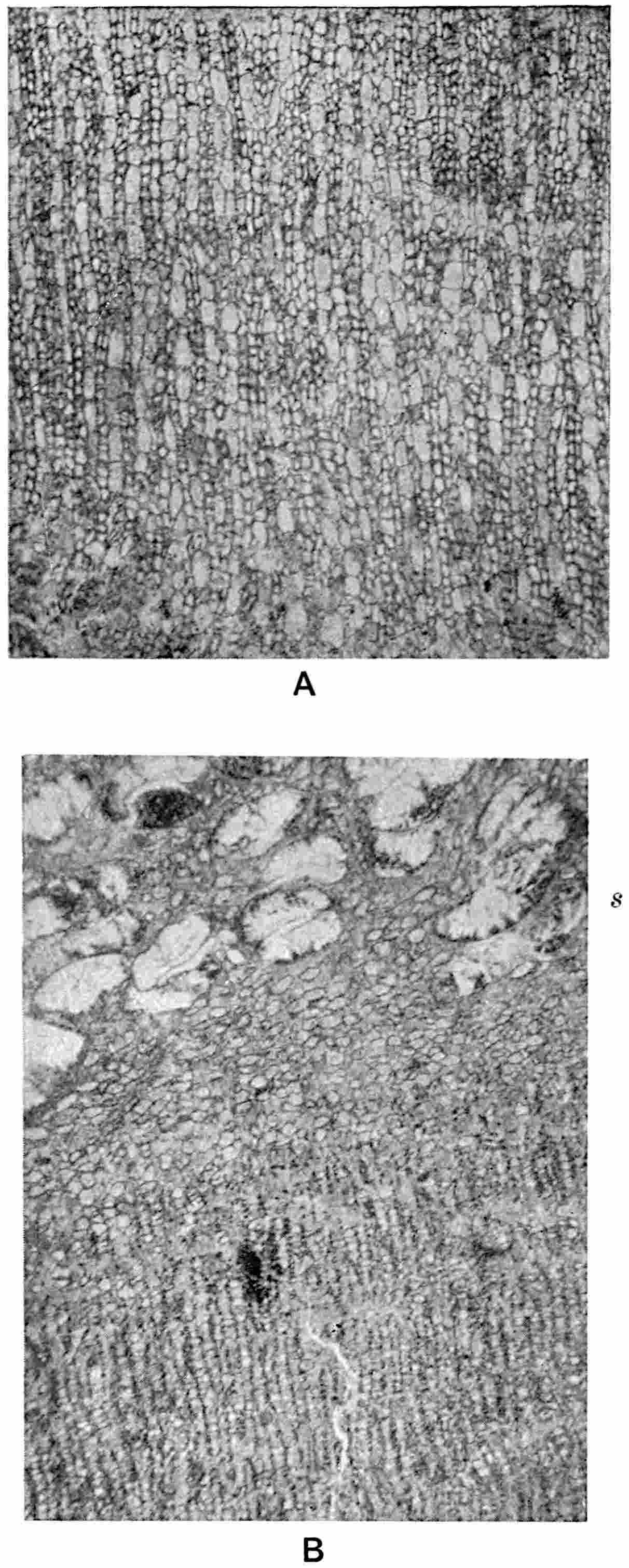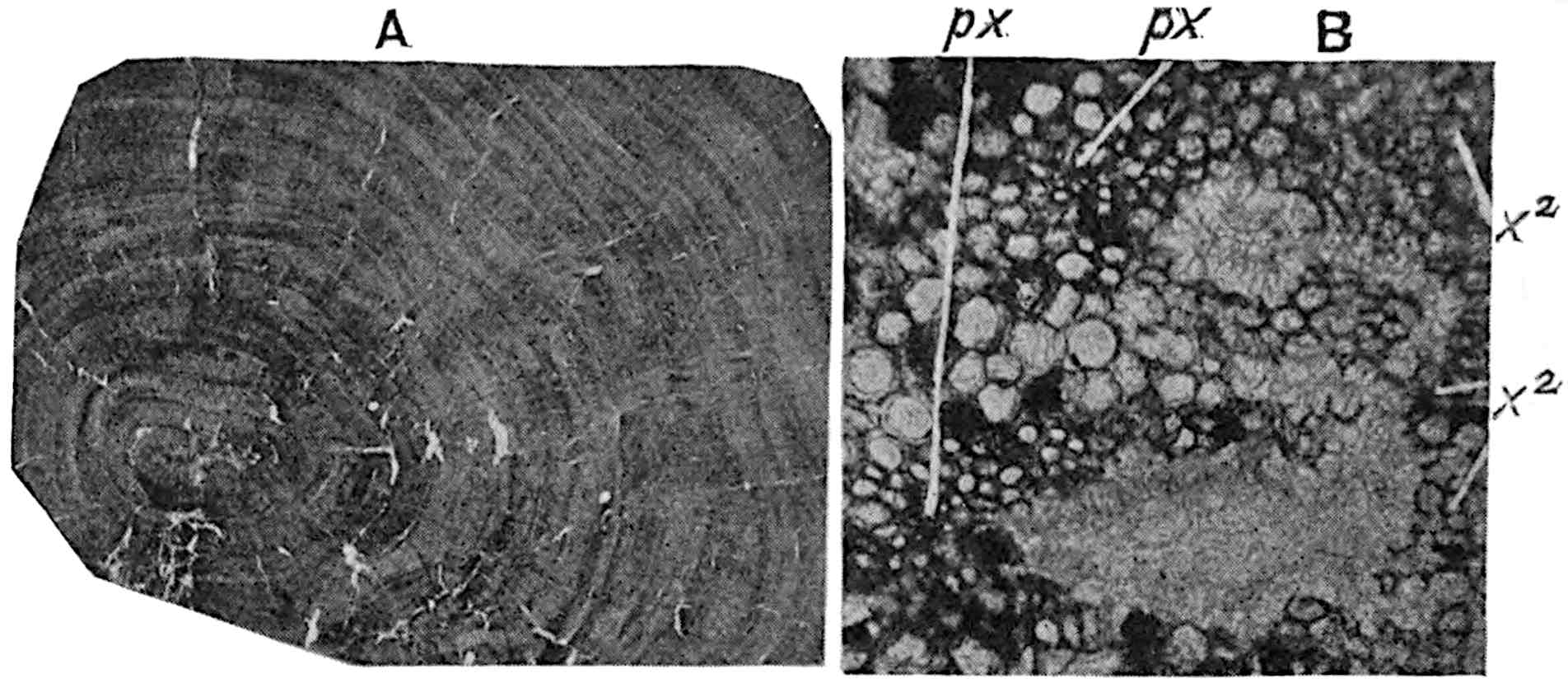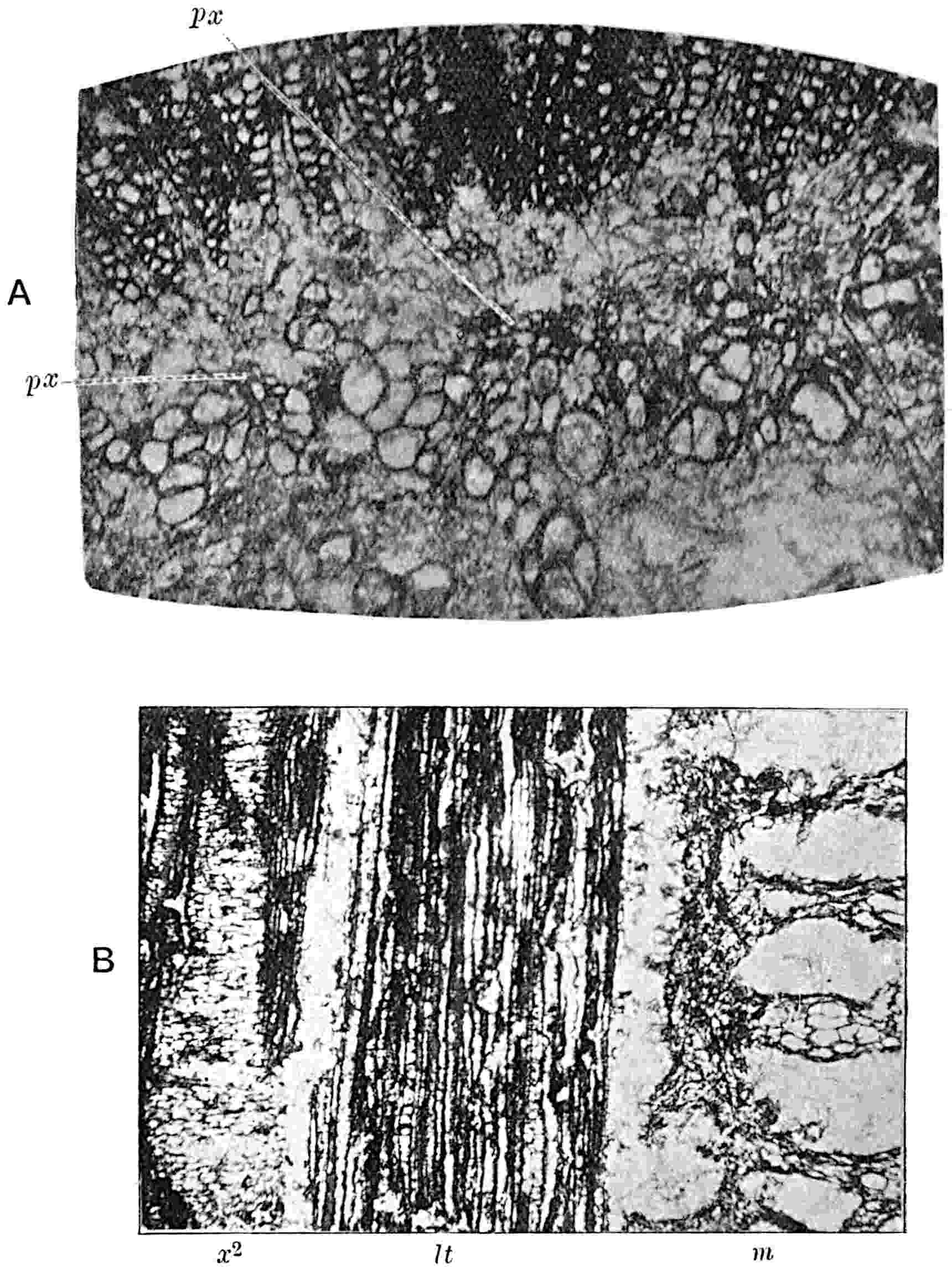 ‘The re-examination of Pitys primaeva and P. antiqua in the light of the structure exhibited by numerous specimens of a new species recently discovered in Haddingtonshire has shown that all three types are similar as regards the structure of the primary wood. In each case the primary cylinder is comparable with that in Archaeopitys Eastmanii [see p. 290], i.e., there are medullary as well as circummedullary xylem-strands. In certain specimens of the new species, Pitys Dayii, the bark and leaves are preserved and thus the details of leaf-trace emission from the stem have been determined. The leaves are short and stout and taper gradually to a point, quite distinct from the long, thin, spatulate Cordaitean foliage. The internal structure of the leaf renders it easily distinguishable from the Cordaites type while it tends to accentuate the possible relationship of Pitys with the Lyginodendreae.’