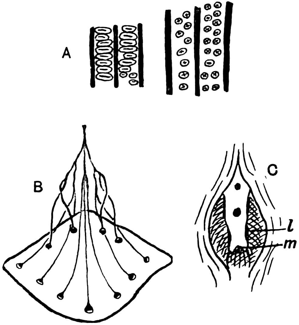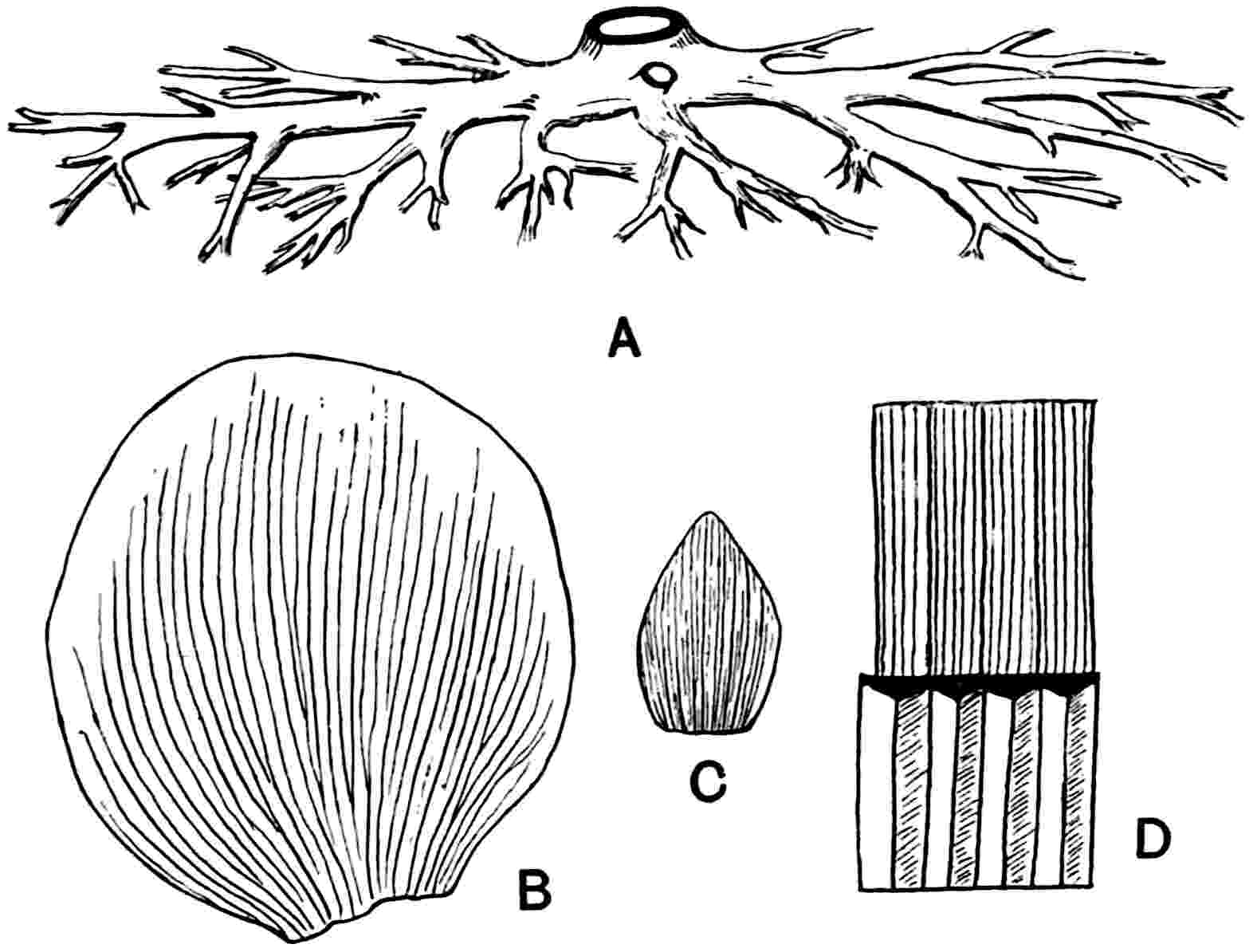This genus[1659] was named after the Swedish naturalist Nilsson who had figured certain plants from the Lias of Höör referred by Fries to the Ferns: these were named by Brongniart Nilssonia brevis and N. elongata and classed with the Cycads. The type-specimens of the latter species are regarded by Nathorst as a form of N. brevis. The history of the genus is fully discussed in Nathorst’s able monograph[1660]. Nilssonia, founded on fronds which with one exception are known only as casts or impressions, may be thus defined: Fronds with circinate vernation, at least in the type-species Nilssonia brevis (fig. 619, C, D), similar in shape to the leaves of Scolopendrium vulgare and Polypodium irioides and to such unusual forms of Cycas fronds as those reproduced in figs. 384, 387, I[1661], in which the laminae of the pinnae are concrescent and form a continuous or deeply cut lamina. They may reach a length of 60 cm. and a breadth of 10 cm. and some specimens are known in which the leaf is less than 1 cm. in width. The lamina is occasionally entire, but in the great majority of cases it is more or less deeply cut into segments of unequal breadth varying considerably in size and shape even in the same species, usually deep and truncate and sometimes long and narrow (e.g. N. pterophylloides, fig. 619, B). An important distinguishing feature is the attachment of the lamina to the upper face of the rachis which it covers: the extension of the lamina over the surface of the frond axis and the rare occurrence of branching 568of the veins are characters in which Nilssonia differs from Taeniopteris. The veins are given off at right-angles or obliquely from a very narrow groove occupying the median line of the rachis; they are nearly always simple and in some of the more fleshy leaves, e.g. N. brevis, they are seldom visible. The surface of the lamina may be smooth or transversely corrugated. The rachis forms a prominent rib on the under surface of the frond (fig. 620, A) and may be continued beyond the lamina as a short petiole. Epidermal cells polygonal or rectangular, with straight walls in contrast to the sinuous walls of Taeniopteris; some of the cells bear strongly cuticularised papillae, possibly the bases of hairs (compare the hairs on the fronds of Acrostichum crinitum, a Fern with leaves similar in shape to some of the large entire fronds of N. orientalis though relatively broader and with anastomosing veins). Stomata usually confined to the lower epidermis and not very numerous; guard-cells of rounded contour and without any special thickening surrounded by 6–8 accessory cells with thickened walls (fig. 611, B) forming a chimney slightly raised over the stomatal pore[1662]. In Nilssonia the guard-cells do not exhibit that regularity of orientation which characterises the stomata of Ptilophyllum, Otozamites, and other Bennettitalean fronds. Little is known of the anatomy of the leaves: in a petrified leaf of N. orientalis[1663] from Upper Cretaceous rocks in Japan there is no palisade-tissue and small groups of sclerenchyma occur above and below the veins. The xylem appears to be centripetal, but the preservation is far from satisfactory. A few secretory canals were found near the edge of the leaf. We have no certain knowledge of the reproductive organs. The small circular projections figured by Schenk[1664] on some leaves of Nilssonia polymorpha as sporangia have no claim to be so regarded. In the description of N. brevis reference is made to some seeds discovered by Nathorst which may belong to that species. Nathorst suggests the possibility that the Rhaetic fossil Stenorrachis scanicus Nath. may be the seed-bearing shoot of a Nilssonia, either N. brevis or N. polymorpha, and if this surmise is correct it almost necessarily involves the genus Beania[1665] which has been tentatively referred to the 569Ginkgoales though without any convincing evidence to support such connexion. Nothing is known of the stems: the occasional occurrence of leaves converging towards a common support points to a Cycadean habit. It is possible, as Nathorst suggests, that the Rhaetic species Bucklandia Saportana[1666] may be the stem of a Nilssonia.
