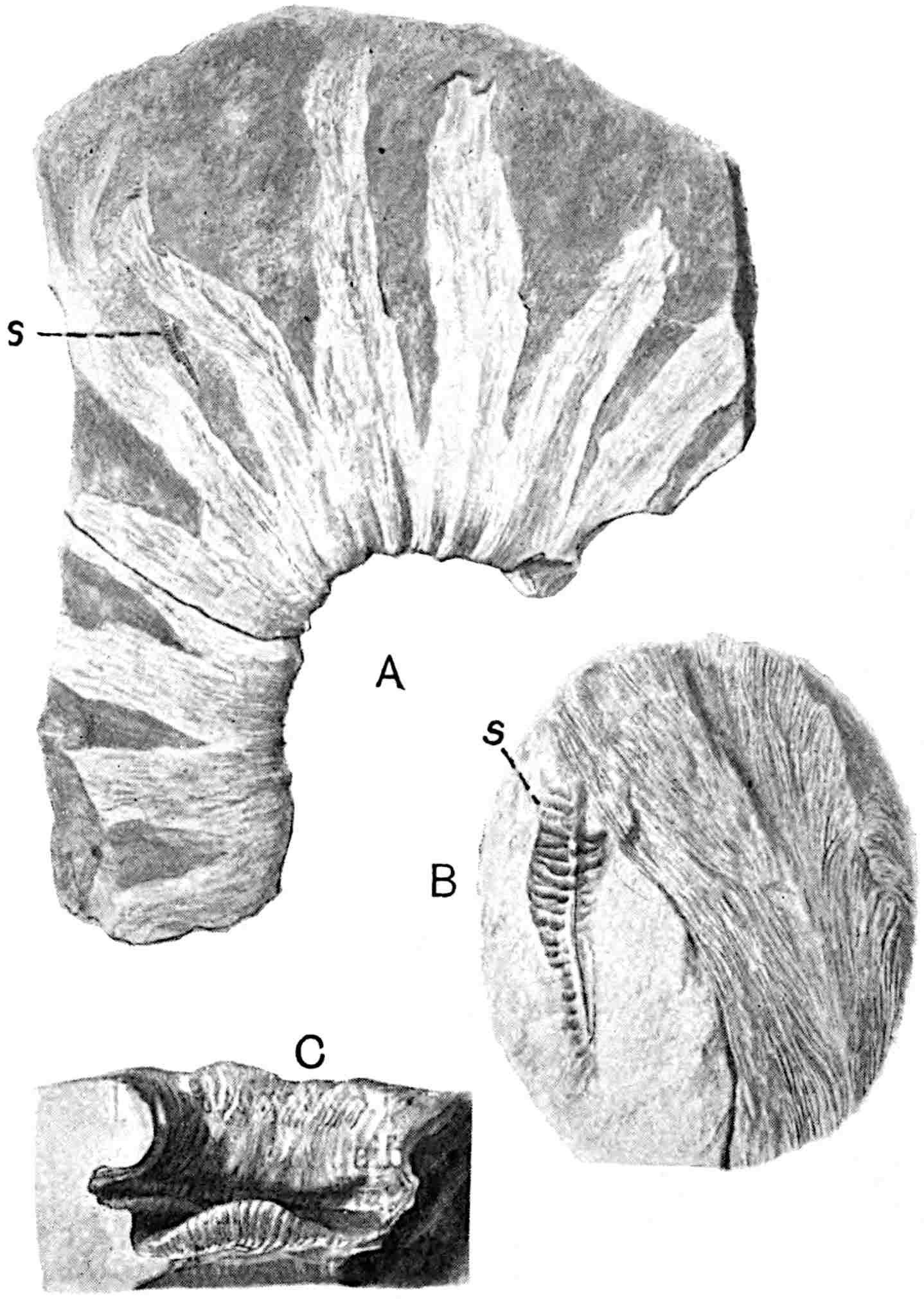 This species[1595] was founded on a large frond from the Commentry coalfield with a stout rachis bearing linear pinnae, attached along a narrow groove on its outer edge, reaching a length of 12 cm. and a breadth of 1 cm.; adjacent pinnae are united at the base. The apices are pointed and there are 10–12 unbranched veins in the lamina. Fig. 612 shows a small piece of the large specimen in the Natural History Museum, Paris.