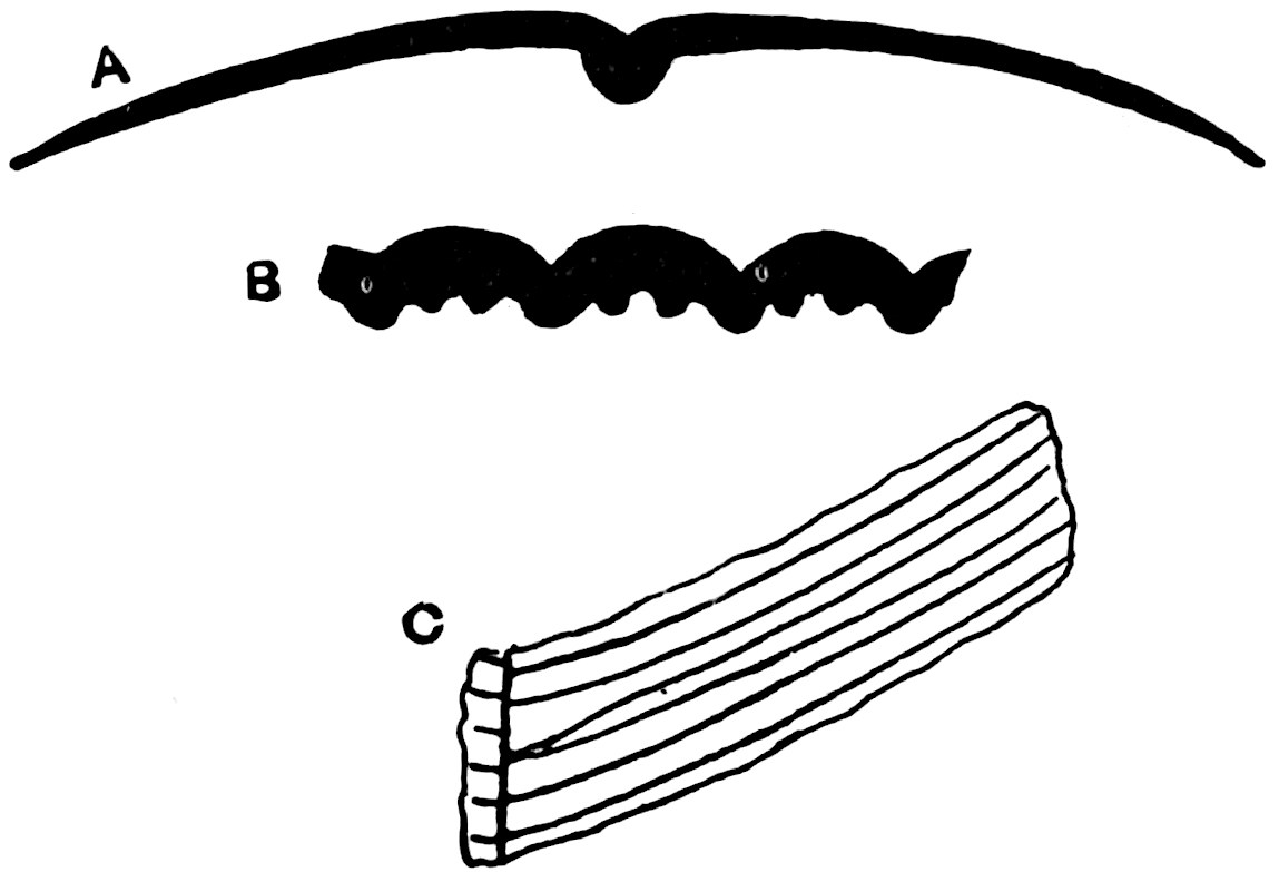 This species[1576], from rocks usually spoken of as Liassic but not improbably Middle Jurassic in age, differs from D. falcatus in the slightly more falcate form of the pinnae and in the more strongly auriculate upper angle of the base of the lamina. The stomata[1577] are confined to the lower epidermis and the strongly cuticularised guard-cells frequently lie at right-angles to the course of the veins. The epidermal cells have very sinuous walls (fig. 609, C) and in the middle of each is a prominent papilla.