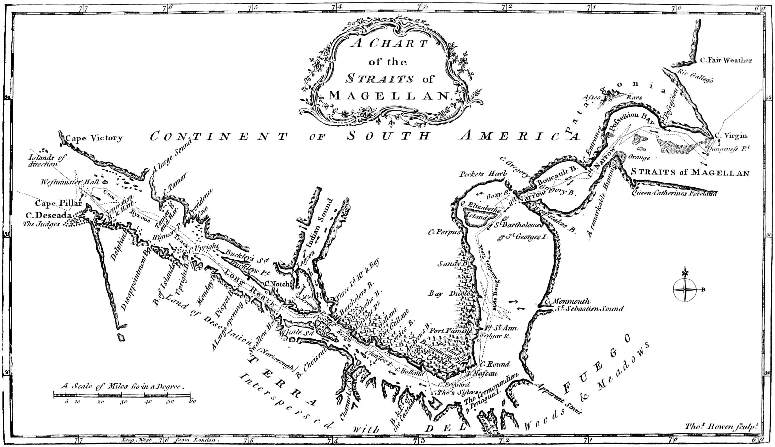 The Commodore recommends it to future navigators, to be at the eastern entrance of the Streight of Magellan in December; in which case he thinks even a fleet of ships might navigate it safely in about three weeks. He observes, that the facility with which wood and water are to be obtained; the vast plenty of vegetables on the coast, and the abundance of fish which may be almost every where procured, are advantages highly in favour of this passage. It is remarkable, that in seven weeks and two days, the time they were in passing it, not a single man was sick of the scurvy, or any other disorder.